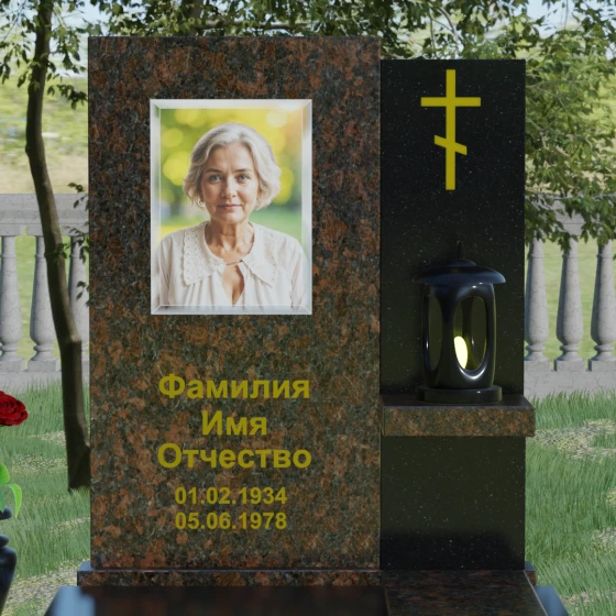 Представленная модель отличается изысканной асимметрией и сложной геометрией, где две вертикальные стелы разной высоты сливаются в единый гармоничный ансамбль. Левая часть, более высокая и массивная, имеет плавный дугообразный срез в верхней части. Этот мягкий изгиб символизирует бесконечность жизненного пути и обретенный вечный покой, смягчая строгость натурального камня. На этой панели располагается портрет и основная информация, выполненная глубокой гравировкой с золочением. Правая часть композиции, выполненная из контрастного камня, служит духовным акцентом: на ней закреплен лаконичный православный крест, сияющий золотом, что подчеркивает веру и надежду на вечную жизнь.