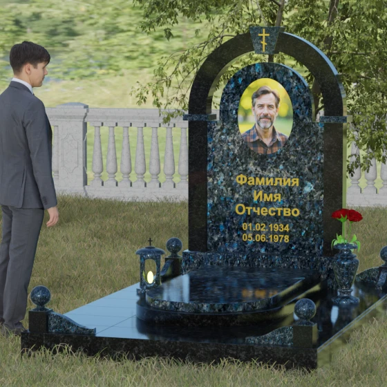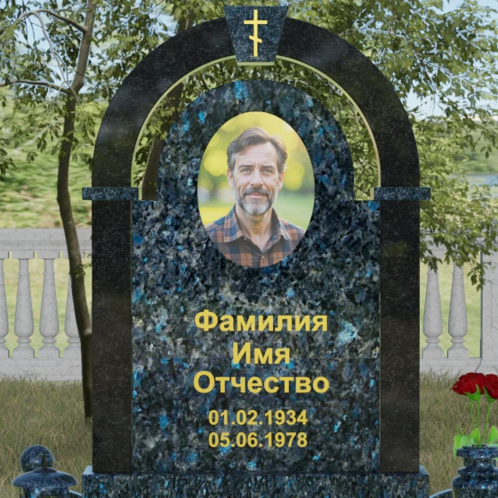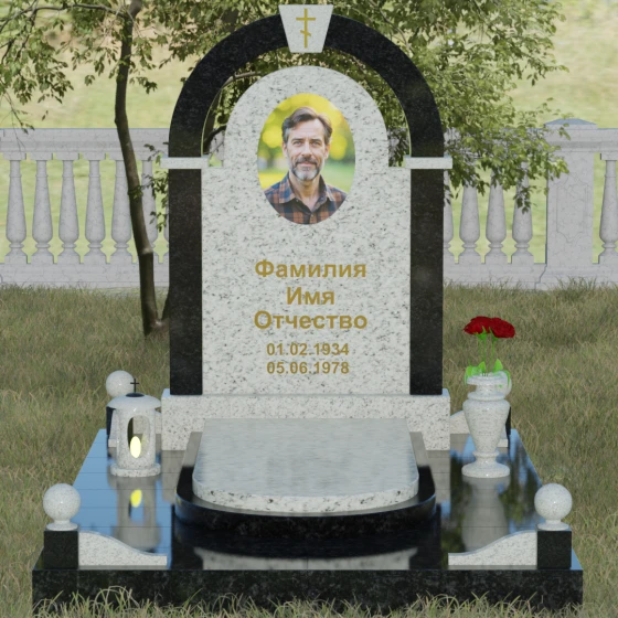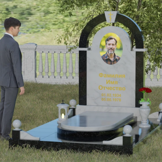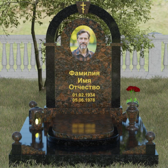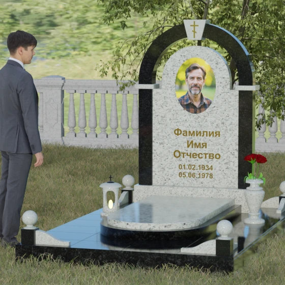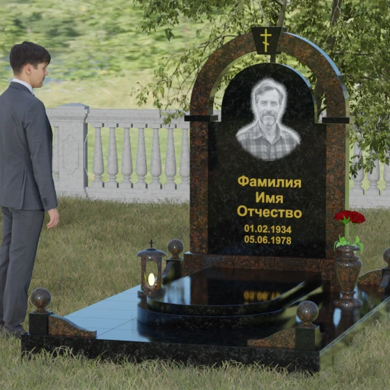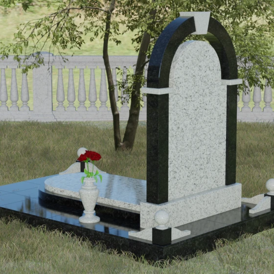 Представленная мемориальная композиция — это триумф архитектурной мысли, воплощенный в благородном камне. В основе дизайна лежит классическая форма арки, которая во многих культурах символизирует небесный свод и торжественный переход в вечность. Центральная стела, имеющая мягкое скругление сверху, обрамлена массивным внешним контуром, создающим эффект глубины и защищенности. Такое многоуровневое решение позволяет играть на визуальных объемах: строгие вертикальные линии боковых колонн уравновешиваются плавным изгибом верхней части, подчеркивая гармонию и покой. Зеркальная полировка лицевых граней доведена до совершенства, в ней отражается мир, напоминая о хрупкой связи между прошлым и настоящим.