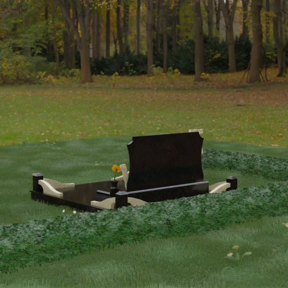 Данная мемориальная композиция включает в себя полное благоустройство участка, что избавляет от необходимости дополнительного оформления. Основанием служит высокий гранитный цоколь, обеспечивающий устойчивость и долговечность всей конструкции. Территория полностью закрыта монолитными надгробными плитами с зеркальной полировкой — это не только придает захоронению величественный вид, но и значительно упрощает уход, предотвращая рост сорной травы и скопление влаги.