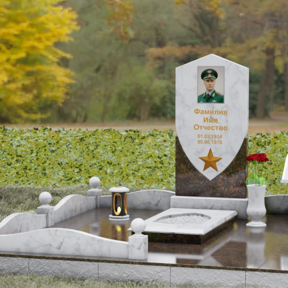 Форма щита в мемориальной архитектуре традиционно олицетворяет защиту, честь и непоколебимую волю. Это надгробие из натурального камня словно оберегает покой усопшего, напоминая о его мужестве и твердости духа. Выбор именно такой формы подчеркивает, что человек при жизни был опорой для своей семьи и преданно служил своему делу. Звезда и строгие формы акцентируют внимание на дисциплине и преданности идеалам.