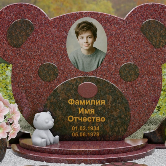 Эта мемориальная композиция представляет собой уникальный художественный проект, созданный для того, чтобы выразить бесконечную нежность и светлую печаль. Главная стела выполнена в форме головы медвежонка — символа чистоты, детства и вечного сна. Плавные, округлые линии силуэта лишены острых углов, что придает изделию визуальную мягкость и умиротворение. Мастера-камнерезы виртуозно передали геометрию образа: симметричные ушки со светлыми вставками и выразительные круглые глаза, созданные методом инкрустации камня другого оттенка. Игра контрастов между глубоким темным основанием и светлым матовым срезом декоративных элементов создает эффект живого объема, заставляя свет играть на полированных гранях и подчеркивая безупречную пластику камня.
