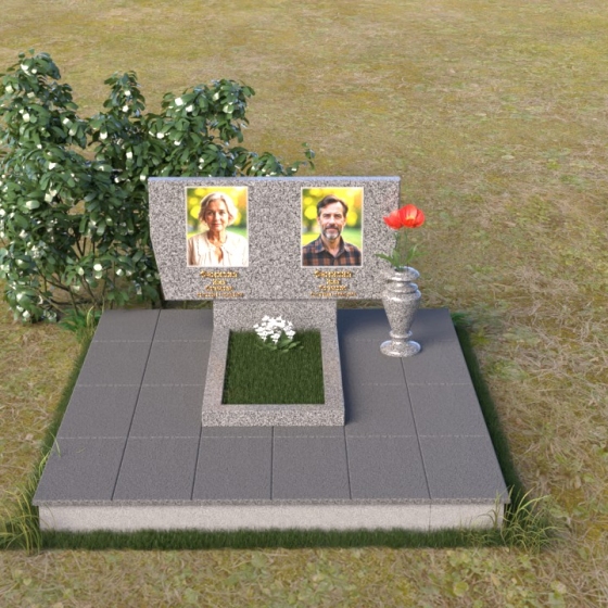 Это ритуальное изделие представляет собой гармоничное сочетание прямых линий и мягких, едва уловимых изгибов, создающих ощущение покоя и умиротворения. Стела имеет прямоугольную форму, но ее верхняя грань слегка скошена, что придает ей визуальную легкость и динамику. Обратите внимание на зеркальную полировку лицевой стороны – она отражает небо и окружающий мир, словно заключая в себе вечность. На полированной поверхности выгравированы портреты усопших и памятные надписи, выполненные с высокой точностью и детализацией. Слева от стелы, на основании, располагается небольшая горизонтальная плита с аналогичной полировкой, создающая дополнительное пространство для цветов или памятных предметов. Основание памятника выполнено из серого камня с матовой фактурой, что создает контраст с блестящей стелой и придает композиции устойчивость и завершенность. Рядом с плитой установлена ваза, выполненная из того же черного полированного гранита, что и стела, что обеспечивает единство стиля и служит достойным обрамлением для живых цветов, символизирующих вечную память.