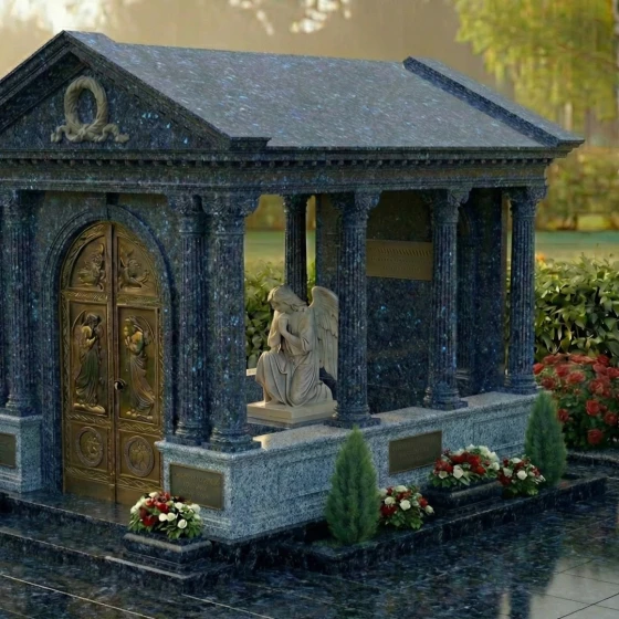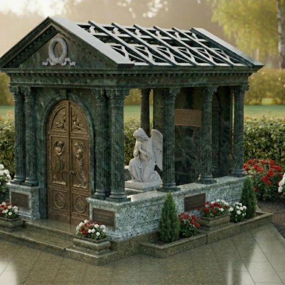 Представляем вашему вниманию величественную стелу – монументальный мемориальный комплекс ПН 043, который является не просто памятником, а настоящим произведением искусства, воплощающим глубокое уважение и вечную память. Этот архитектурный шедевр выполнен в форме изящного мавзолея с открытой крышей, создающей ощущение возвышенности и стремления к небесам. Строгие, но при этом гармоничные линии классической архитектуры, с колоннами и фронтоном, придают комплексу неподвластную времени элегантность. Центральное место занимает величественная стела, выполненная из темного, глубоко полированного камня, который словно зеркало отражает свет, символизируя чистоту и ясность воспоминаний. На этой стеле, расположенной внутри мавзолея, предусмотрено идеальное пространство для гравировки портрета и памятных слов, которые будут увековечены с особой торжественностью. Рядом с ней, в скорбной позе, застыла фигура ангела, вырезанная из светлого мрамора. Ее нежные, плавные линии и объемные складки одеяния создают трогательный контраст с полированной поверхностью стелы, добавляя композиции глубины и эмоциональности. Каждая деталь резьбы, будь то изысканный венок на фронтоне или тонкие узоры на дверях, выполнены с поразительной точностью и мастерством, подчеркивая уникальность и достоинство этого монумента.