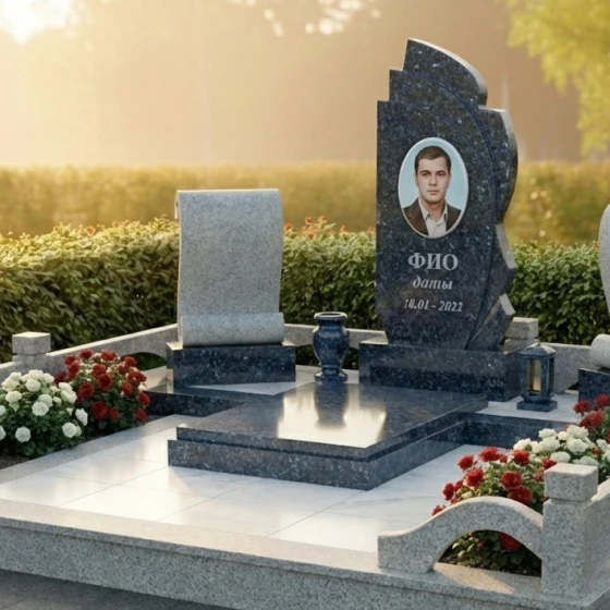 Оформление: Для данной формы монумента идеально подходят как классические, так и современные стили гравировки. Портрет усопшего, выполненный в технике фотогравировки на зеркально отполированной поверхности, будет выглядеть особенно выразительно и реалистично. Рекомендуется размещать портрет в верхней части центральной плиты, а под ним — ФИО и даты жизни, выполненные элегантным шрифтом, который гармонично сочетается с общим стилем монумента. Можно также рассмотреть возможность добавления небольшого символического элемента, такого как ветвь, цветок или крест, в нижней части плиты, чтобы усилить эмоциональное воздействие.