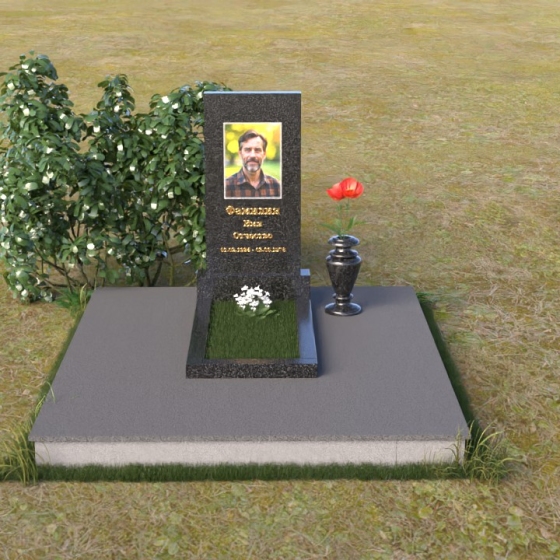 Мемориальная композиция представляет собой вертикальную стелу, выполненную в строгой прямоугольной форме, символизирующей стойкость и незыблемость памяти. Верхняя часть стелы, с ее четкими гранями, словно устремлена ввысь, к небесам, напоминая о духовной составляющей человеческой жизни. Боковые грани стелы обработаны с особой тщательностью, создавая эффект благородной сдержанности. Фаска, аккуратно снятая по периметру, придает изделию завершенный и элегантный вид. Горизонтальная плита, расположенная перед стелой, выполнена в зеркальной полировке, отражая небо и окружающий мир, символизируя продолжение жизни и связь с ушедшим.