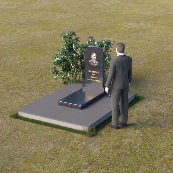Основной акцент в этой модели сделан на контрасте фактур. Зеркальная полировка черного гранита Габбро-диабаз, из которого выполнена стела, создает эффект бесконечности, отражая небо и окружающий мир. На этом фоне особенно выразительно смотрится гравировка портрета и надписи, выполненные с ювелирной точностью. Нижняя часть стелы, переходящая в горизонтальную плиту, также выполнена из черного гранита, но уже с матовой обработкой, что придает композиции дополнительную глубину и текстуру. Рядом располагается ваза из того же гранита, выполненная в классическом стиле, предназначенная для живых цветов, которые станут символом памяти и любви.