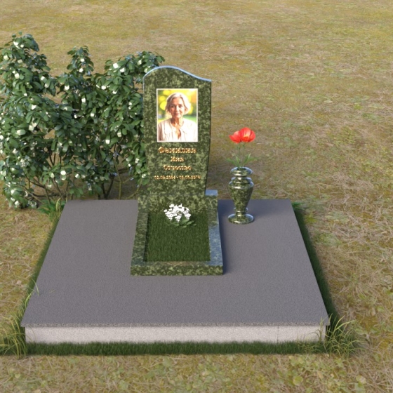 Форма стелы, тяготеющая к классической прямоугольной, предоставляет широкие возможности для персонализации. Портрет усопшего, расположенный в верхней части, будет выгодно подчеркнут лаконичной формой камня. Золотистое начертание имени и дат жизни, выполненное с особым вниманием к деталям, отчетливо выделяется на фоне полированного гранита, создавая четкий и легко читаемый текст. Дополнительно можно разместить эпитафию или памятные слова, которые отразят личность и жизненный путь ушедшего человека. Маленькая гранитная ваза, выполненная в едином стиле с мемориальной композицией, станет достойным обрамлением для живых цветов, привносящих нотку жизни и надежды.