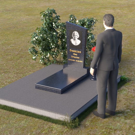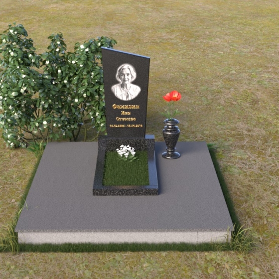 Мемориальная композиция состоит из нескольких элементов, каждый из которых тщательно продуман и выполнен с безупречным качеством. Начинается все с основания – широкой, массивной плиты, которая обеспечивает устойчивость всей конструкции. Её матовая, слегка шероховатая поверхность призвана оттенять блеск полированных элементов, создавая игру фактур и контрастов. Далее взгляд переходит к горизонтальной стеле, расположенной на постаменте. Она выполнена в виде прямоугольника с плавными, скругленными углами, что придает ей мягкость и элегантность. Поверхность стелы отполирована до зеркального блеска, отражая небо и окружающий мир, словно напоминая о связи между земным и небесным. На постаменте возвышается вертикальная стела с портретом и надписью. Верхняя часть стелы имеет скошенный угол, что добавляет динамики и оригинальности всей композиции. На стеле выгравированы имя, фамилия и отчество усопшего, а также даты жизни, выполненные изящным шрифтом. В правом углу композиции расположена ваза, предназначенная для цветов. Её классическая форма и полированная поверхность гармонично дополняют общий стиль мемориала.