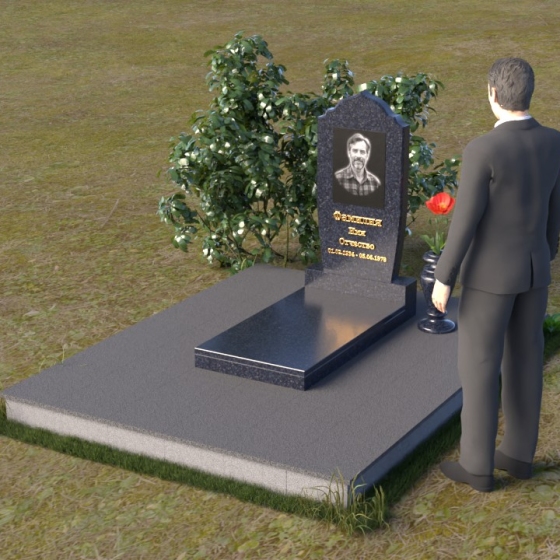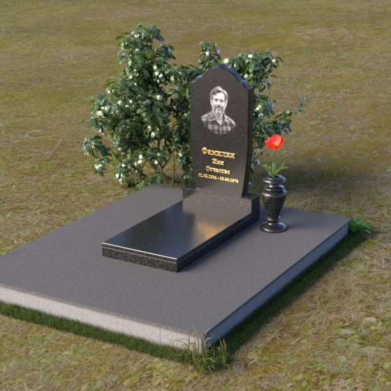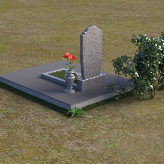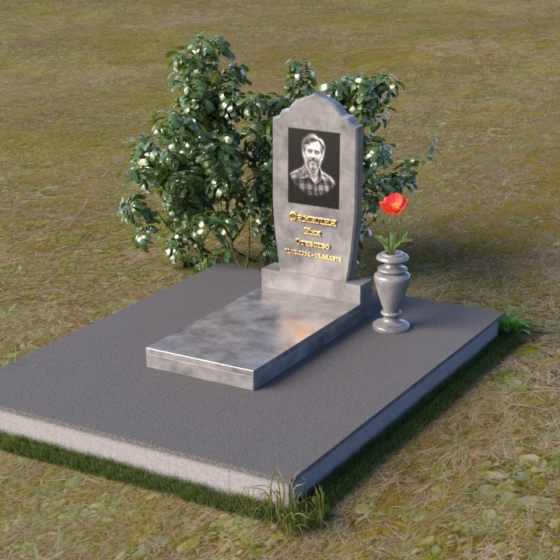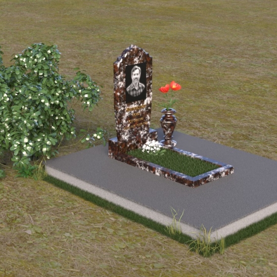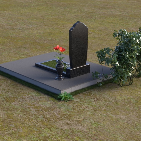 Надгробие из натурального камня ПВ 061 представляет собой элегантную композицию, сочетающую в себе строгость линий и плавные изгибы. Основная стела имеет форму, напоминающую стилизованную арку, с мягкими, скругленными плечами. Верхняя часть стелы украшена деликатными выемками, создающими эффект благородной старины. Боковые грани стелы тщательно отполированы, что придает памятнику законченный и респектабельный вид. Нижняя часть стелы переходит в прямоугольное основание, на которое устанавливается горизонтальная плита. Эта плита, выполненная в зеркальной полировке, отражает небо и окружающий ландшафт, создавая ощущение легкости и воздушности. Фаски на плитах аккуратно сняты, подчеркивая геометрию форм. Сбоку от основной стелы располагается небольшая ваза, выполненная в том же стиле и из того же материала, что и памятник. Ее изящная форма добавляет композиции завершенность и позволяет разместить живые цветы, символизирующие вечную память.