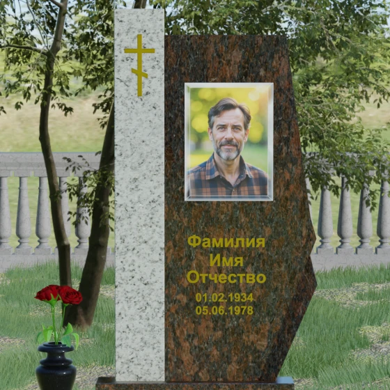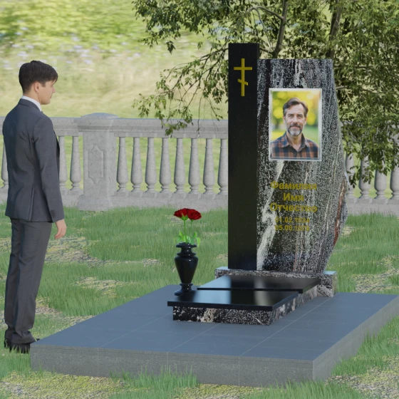 Данная мемориальная композиция — это торжество современной архитектурной мысли, воплощенное в благородном граните. Выбор этой модели обусловлен её уникальной асимметричной геометрией, которая выделяет захоронение на фоне типовых решений. Комбинированное исполнение из двух контрастных видов камня позволяет создать глубокий визуальный акцент: вертикальная колонна из насыщенного красного гранита символизирует духовную опору и жизненную энергию, в то время как основная стела из глубокого черного камня олицетворяет вечный покой и скорбь. Надгробие из натурального камня такой формы выглядит монументально и одновременно изящно благодаря сложной огранке. Правая грань основной стелы дополнена характерным скосом и ступенчатым вырезом, что придает изделию динамику и многогранность. Особое внимание уделено игре света и тени на полированных поверхностях: зеркальный блеск черного гранита отражает небо, создавая эффект глубины, а матовые фаски подчеркивают строгость и чистоту линий архитектурного ансамбля.
