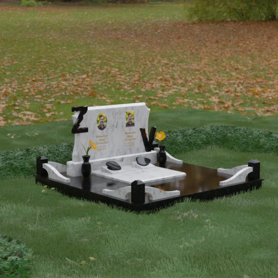 Данная мемориальная композиция включает в себя полное благоустройство участка, что избавляет от необходимости дополнительного оформления. Основанием служит высокий гранитный цоколь, обеспечивающий устойчивость и долговечность всей конструкции. Территория полностью закрыта монолитными надгробными плитами с зеркальной полировкой — это не только придает захоронению величественный вид, но и значительно упрощает уход, предотвращая рост сорной травы и скопление влаги.