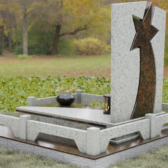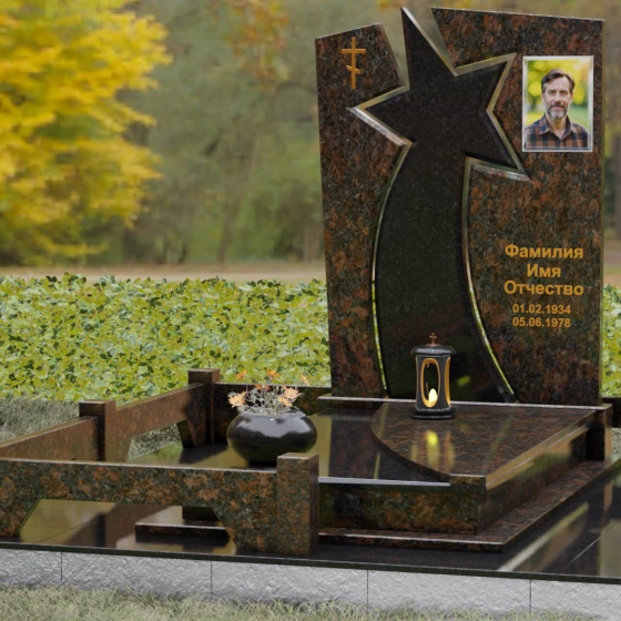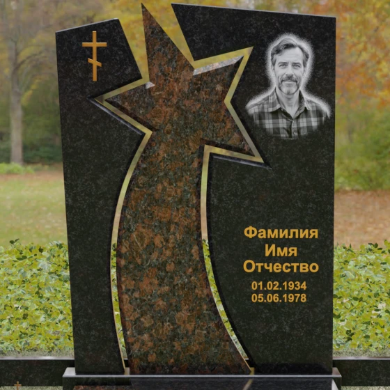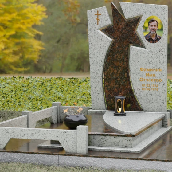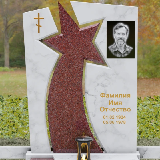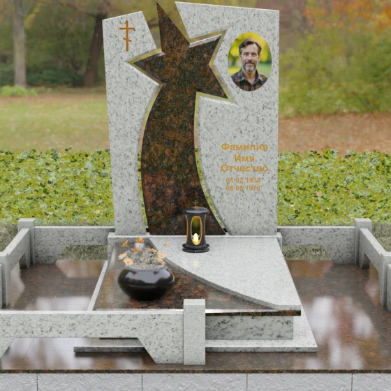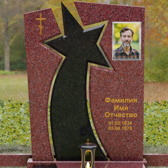 Форма этого мемориала наполнена глубокими смыслами. Центральный символ — звезда — традиционно олицетворяет путеводный свет, высокие достижения и бессмертие души. Для тех, чья жизнь была связана со служением отечеству, этот элемент подчеркивает их доблесть и профессиональный путь. В сочетании с православным крестом композиция говорит о единстве земного подвига и духовного упокоения. Плавные, дугообразные линии, обрамляющие центральную вставку, символизируют непрерывность времени и защиту, которую обретает душа в вечности. Асимметричная верхушка стелы подчеркивает индивидуальность и неповторимость жизненного пути человека.