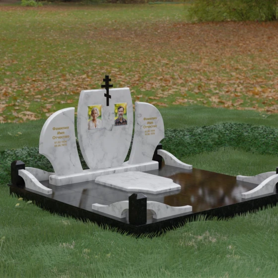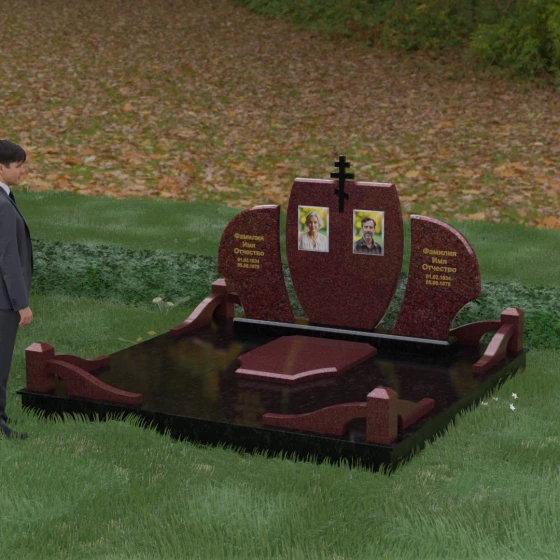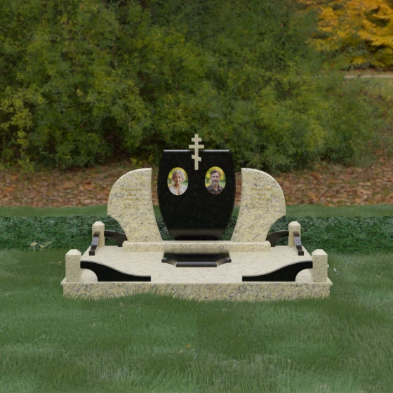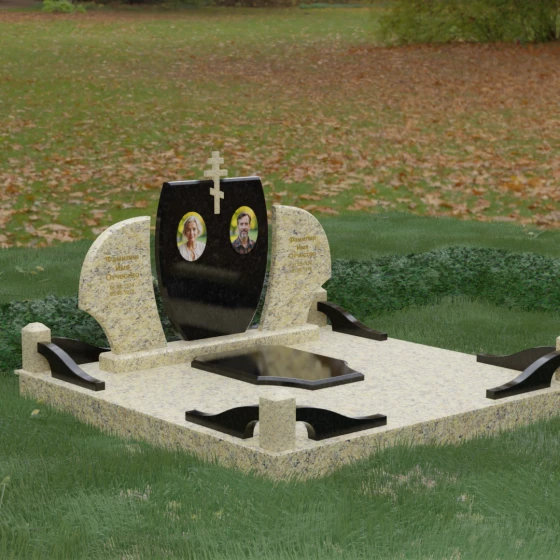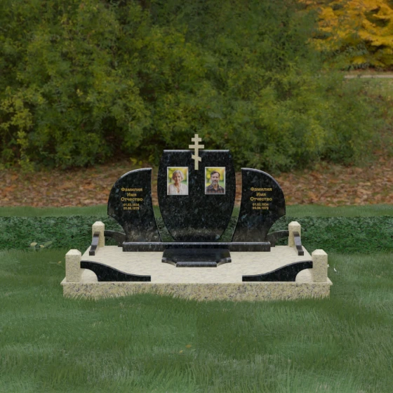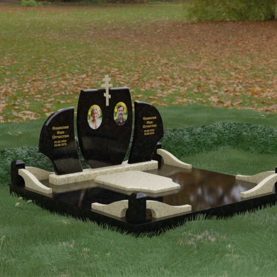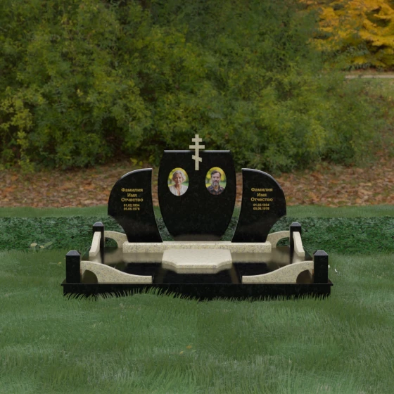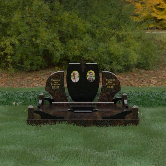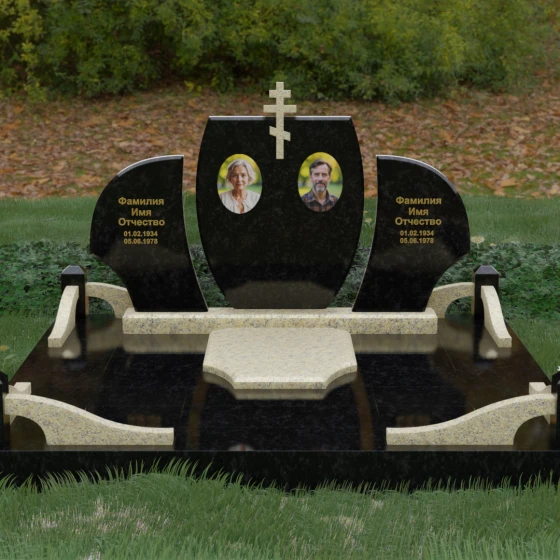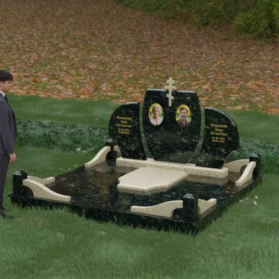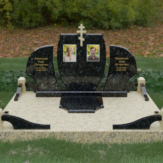 Оформление: для данной формы мы рекомендуем использовать технику глубокой гравировки ФИО с последующим нанесением сусального золота — это подчеркнет благородство темного камня. Овальные фотокерамические портреты идеально размещаются на центральной стеле, сохраняя композиционное равновесие, а золоченый крест визуально объединяет портреты в общую семейную историю.