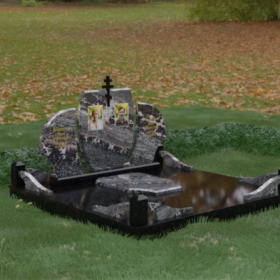 Данное ритуальное изделие представляет собой сложную архитектурную композицию, спроектированную по строгим законам симметрии и эстетического баланса. В центре ансамбля расположена доминирующая стела, чьи очертания напоминают одновременно и защитный щит, и лепестки раскрывающегося цветка. Венчает центральный элемент лаконичный восьмиконечный православный крест, выполненный в контрастном светлом оттенке, что делает его духовным ориентиром всей конструкции. Две боковые стелы, исполненные в форме изящных симметричных крыльев, плавно расширяются кверху, создавая гармоничный визуальный ритм и расширяя пространство для мемориальных надписей. Мастера уделили особое внимание филигранной обработке граней: зеркальная полировка основных плоскостей эффектно контрастирует с матовыми фасками, заставляя свет преломляться под разными углами и создавая глубокий эффект объема и трехмерности.