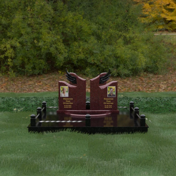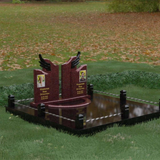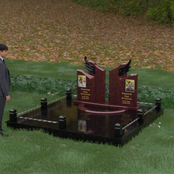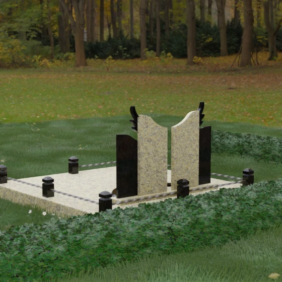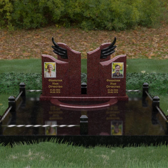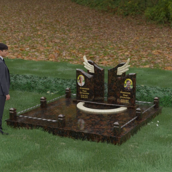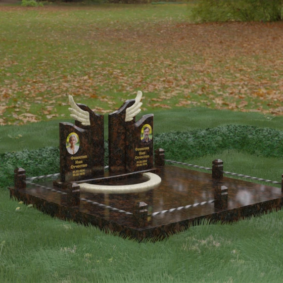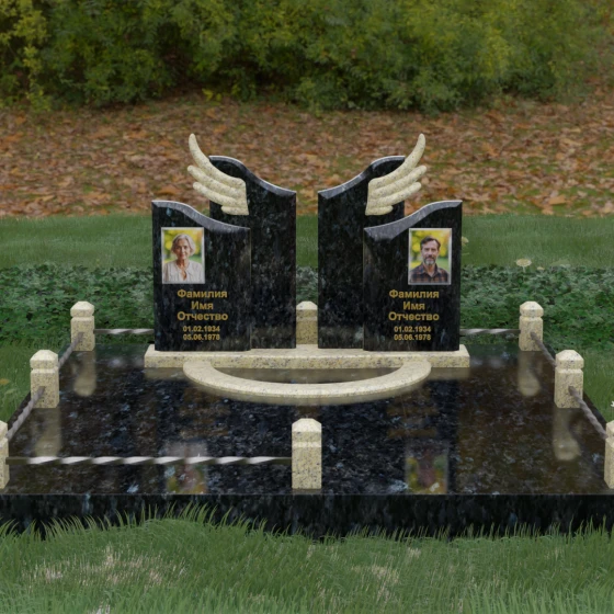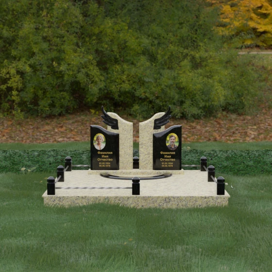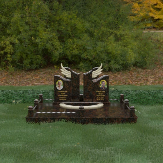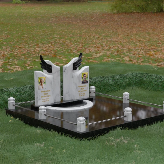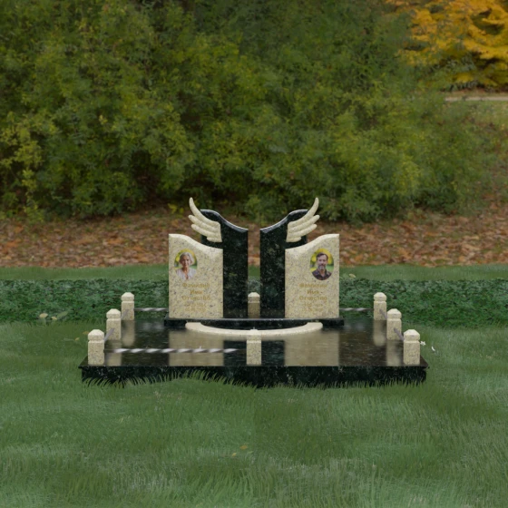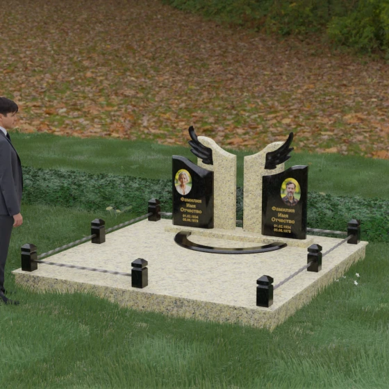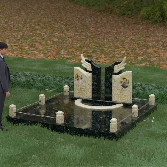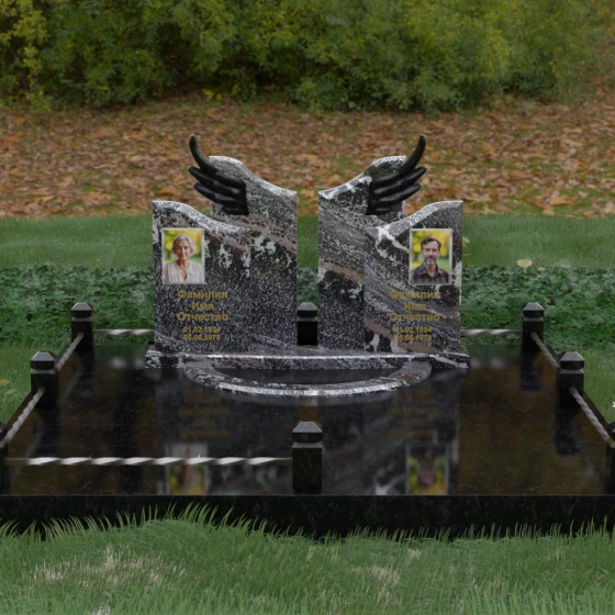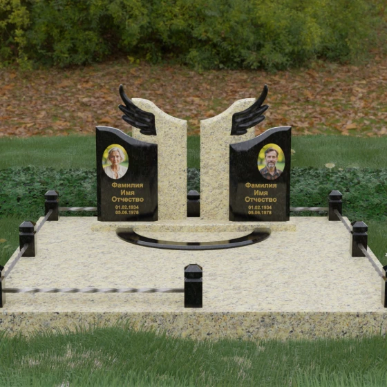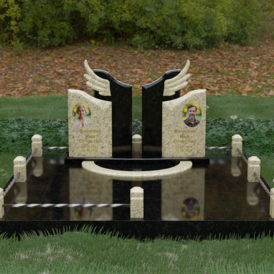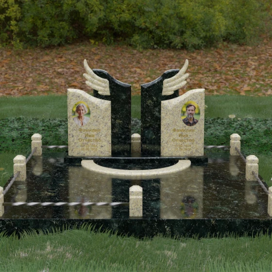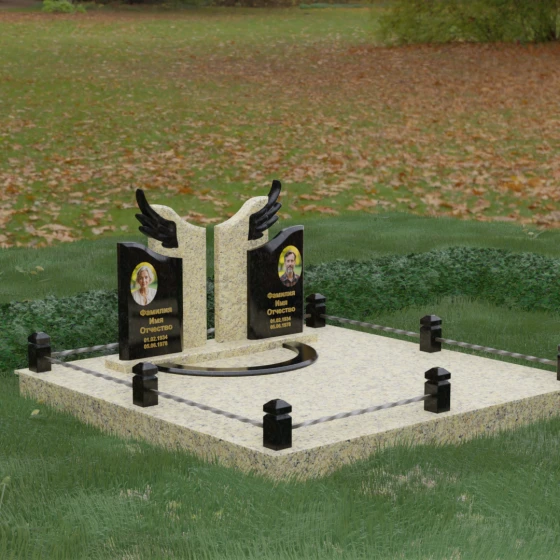 Боковые элементы композиции, выполненные из светлого камня с мягкой зернистой текстурой, несут в себе тепло и светлую память. Их форма напоминает раскрытые свитки или лепестки экзотического цветка, на которых гармонично располагаются портреты и памятные надписи. Отсутствие острых, агрессивных углов в верхней части этих изваяний подчеркивает смирение и покой. Весь ансамбль пронизан идеей дуальности: светлого и темного, земного и небесного, что делает эту модель идеальным выбором для оформления семейного захоронения, где двое близких людей обретают вечный приют под общим кровом божественной защиты.