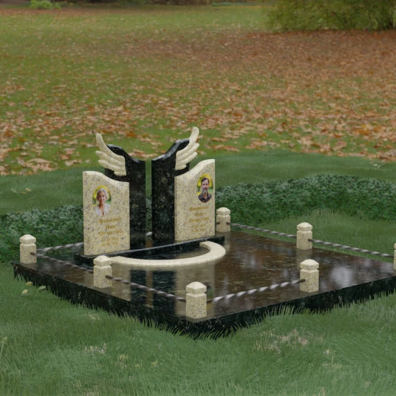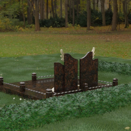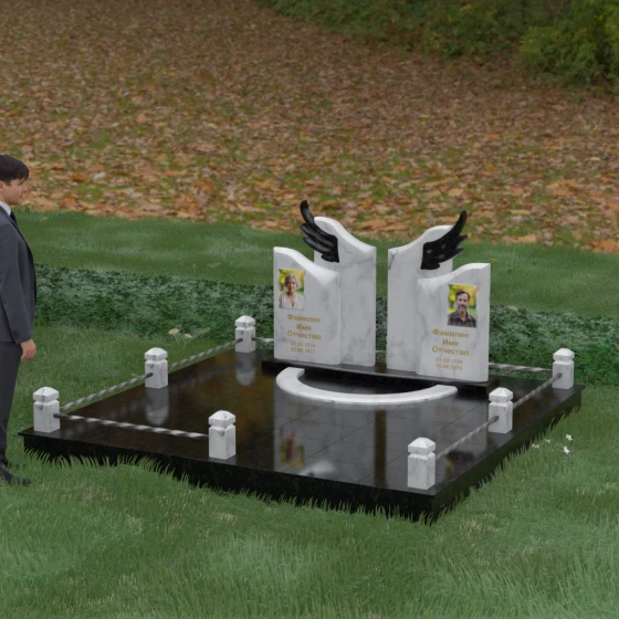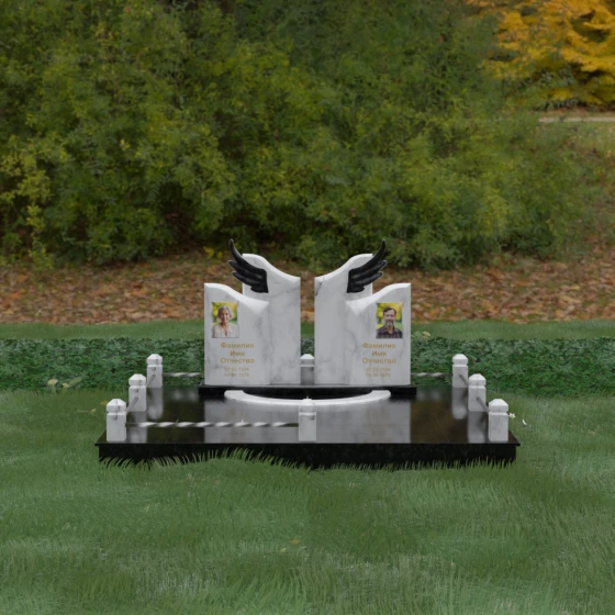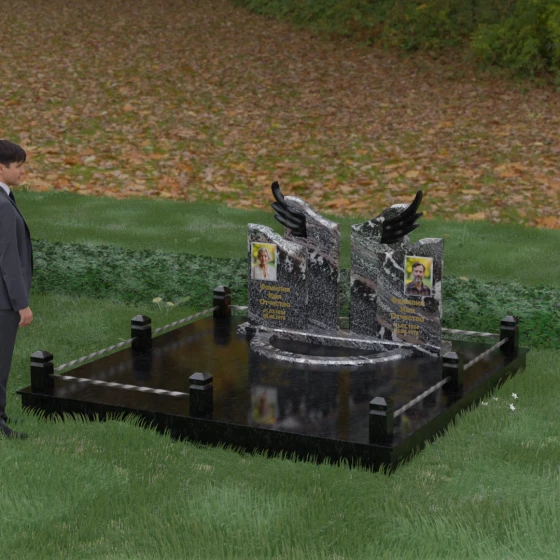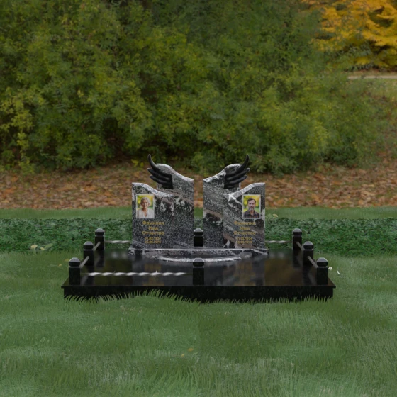 Данная художественная композиция представляет собой не просто мемориал, а глубокое философское размышление о вечности, единстве душ и небесном покровительстве. В центре ансамбля возвышается гранитный монумент, состоящий из двух зеркально расположенных обелисков глубокого черного цвета. Главным смысловым акцентом здесь выступают искусно вырезанные белоснежные крылья, венчающие темные вертикальные плиты. Каждое перо этих крыльев проработано с ювелирной точностью: плавные, стремящиеся ввысь линии символизируют освобождение духа и его полет в высшие сферы. Контраст между угольно-черной зеркальной полировкой основного камня и светлой, почти светящейся фактурой резных элементов создает динамику света и тени, приковывая взгляд и заставляя задуматься о торжественности момента.