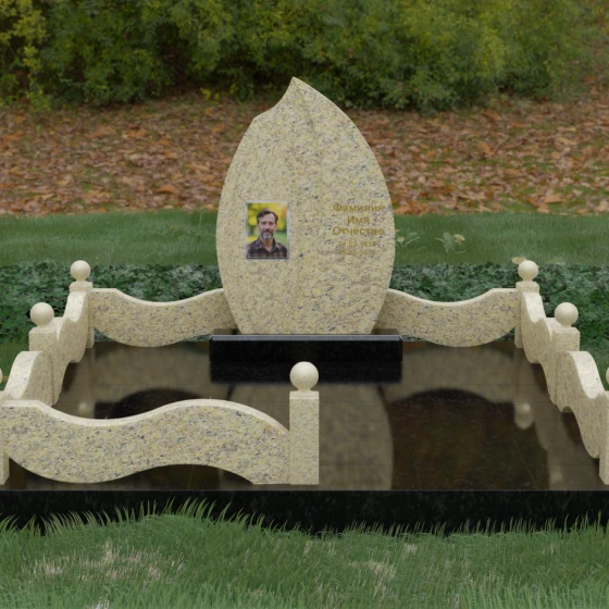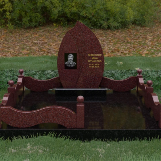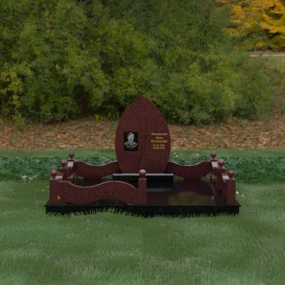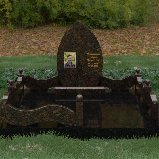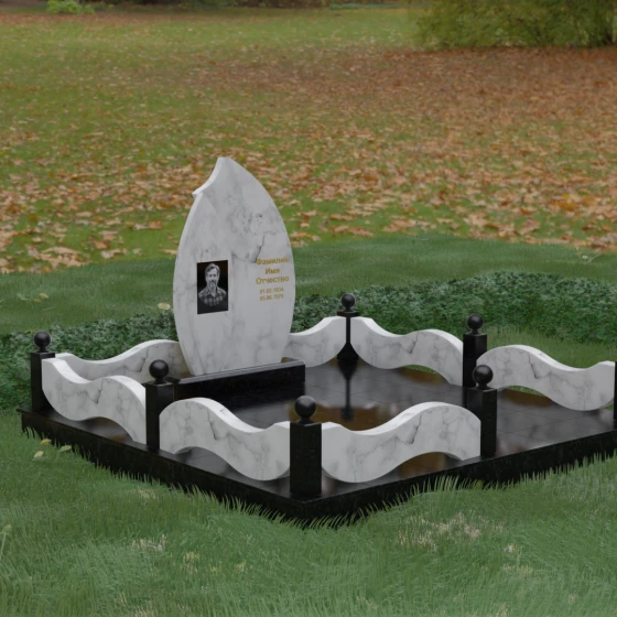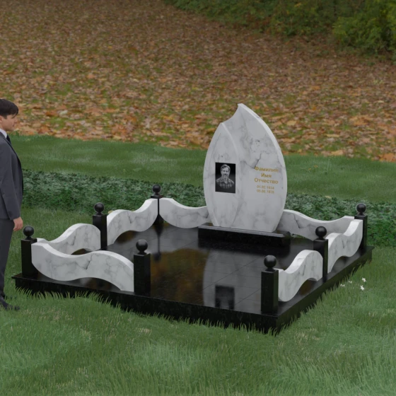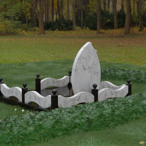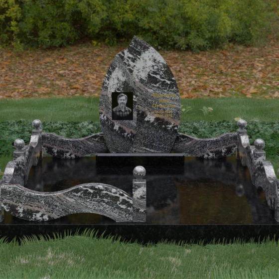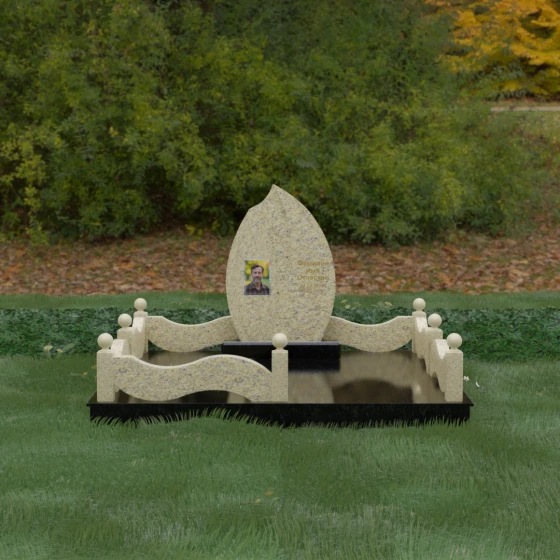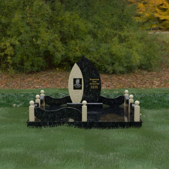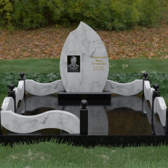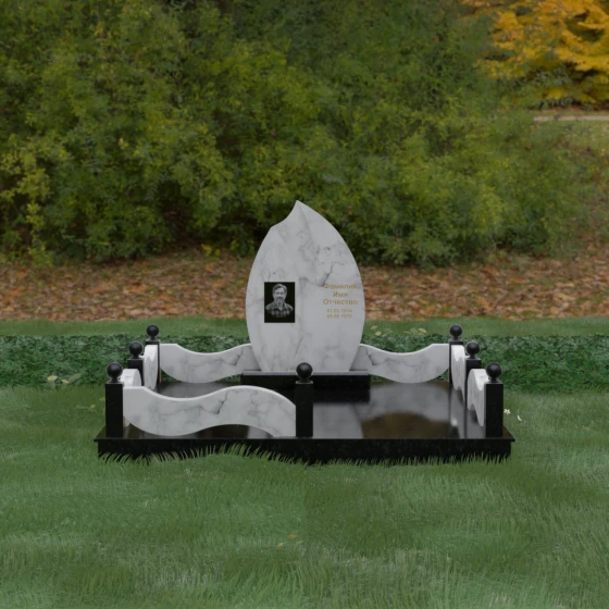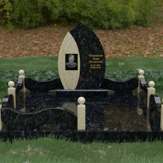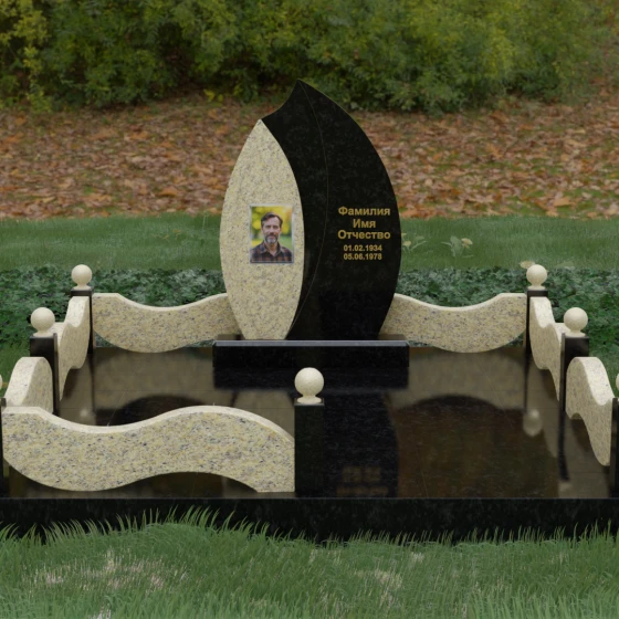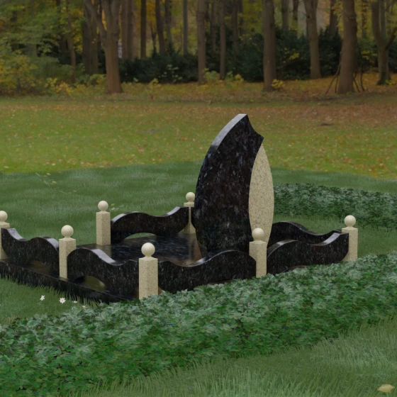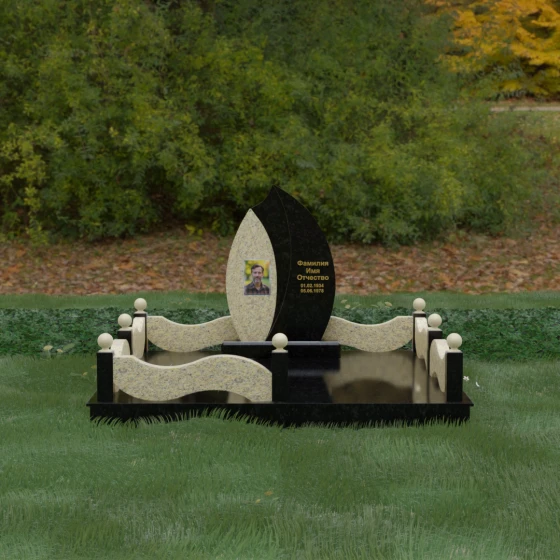 Данная художественная композиция представляет собой истинный шедевр мемориального зодчества, где главная роль отведена безупречной геометрии и глубокому символизму. Форма основного элемента напоминает лепесток или застывшее пламя, разделенное изящным изгибом на две контрастные половины. Такое решение олицетворяет единство противоположностей: светлую память о прожитых годах и вечный покой, выраженный в глубоком темном камне. Использование плавных, текучих линий в сочетании со строгим основанием создает визуальный баланс, который выделяет захоронение на фоне типовых решений, подчеркивая особый статус и значимость личности усопшего.