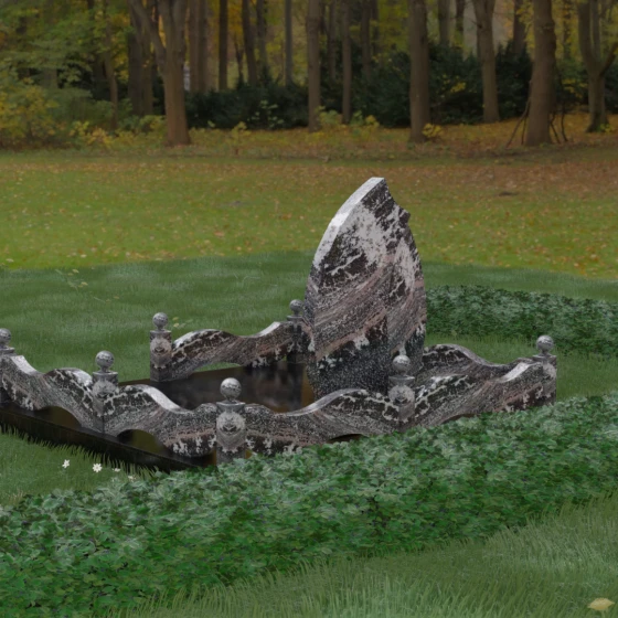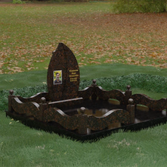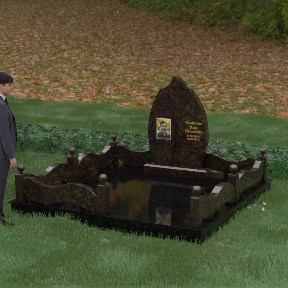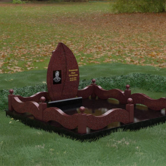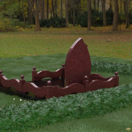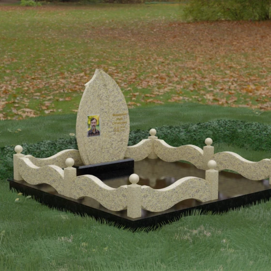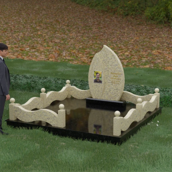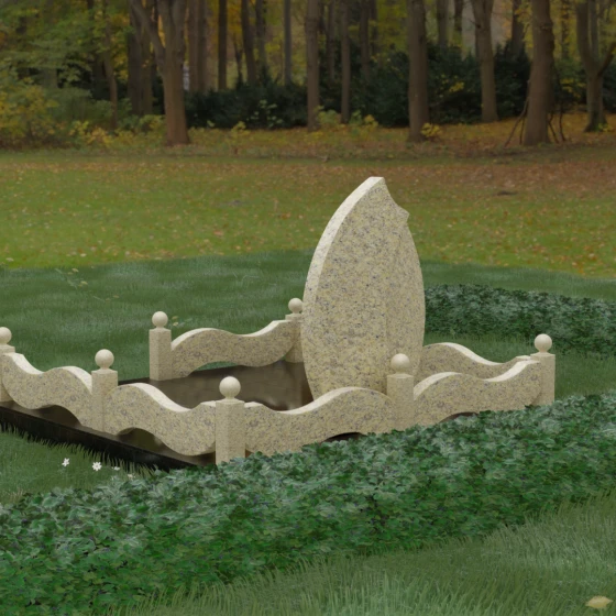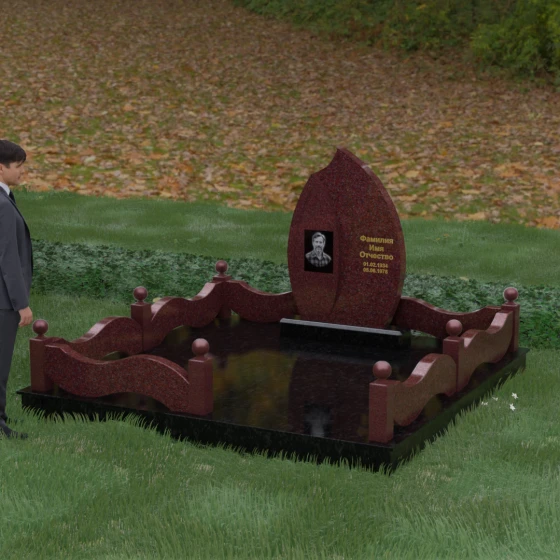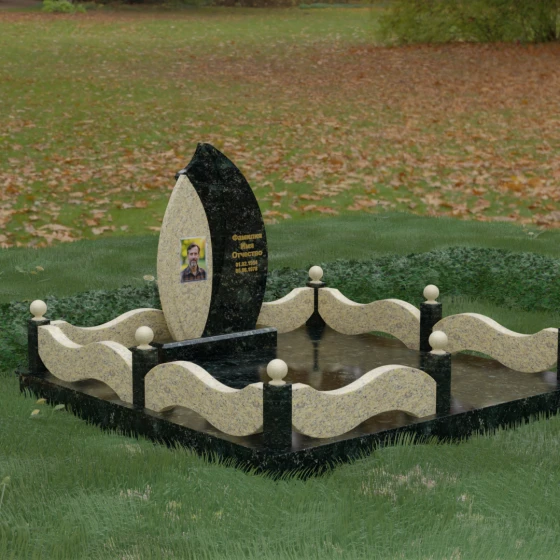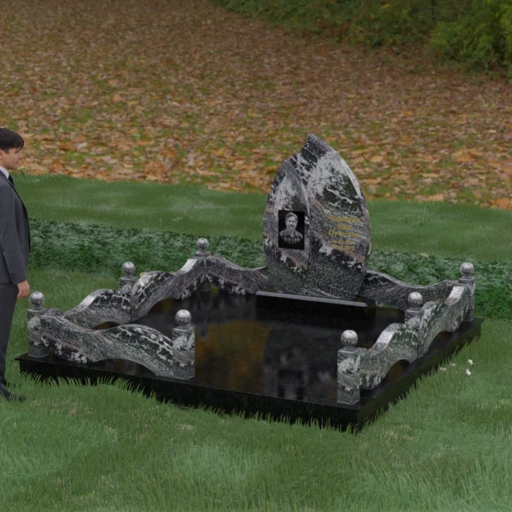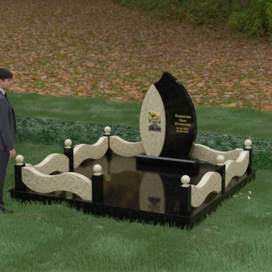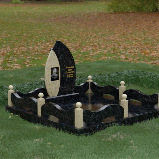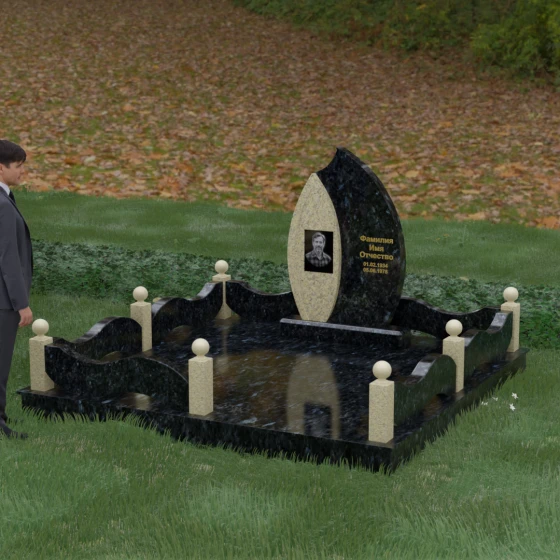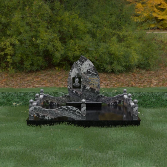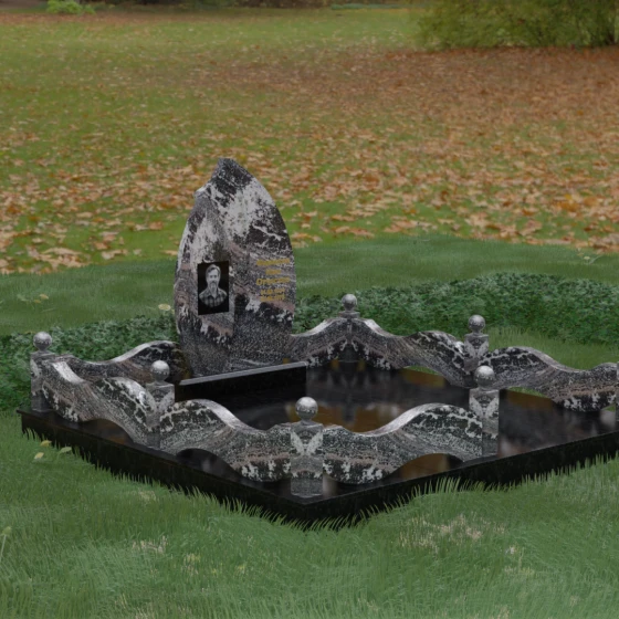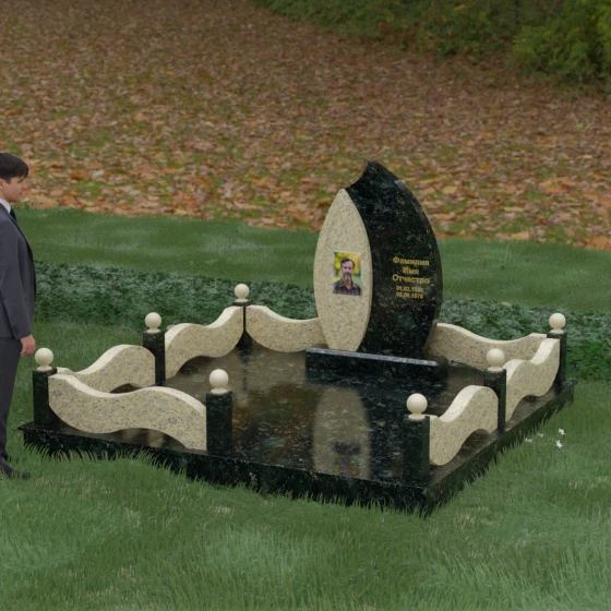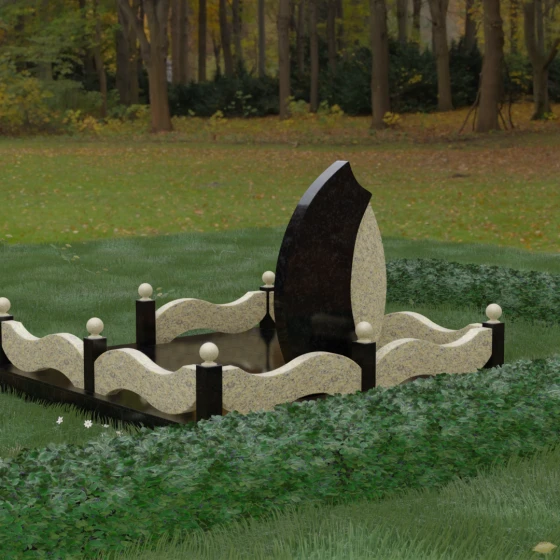 Комплексное благоустройство участка в данной модели заслуживает отдельного описания. Вместо открытого грунта мы предлагаем полную облицовку площади массивными гранитными плитами. Это не только создает завершенный, эстетически безупречный вид, но и практически избавляет от необходимости борьбы с сорняками. Периметр участка обрамляет комбинированный цоколь: темные массивные столбики с идеально отполированными навершиями в виде каменных шаров чередуются с волнообразными светлыми вставками. Эти изящные «волны» в ограждении перекликаются с формой центрального надгробия, создавая единый архитектурный ансамбль, который выглядит как монолитная и нерушимая крепость памяти.
