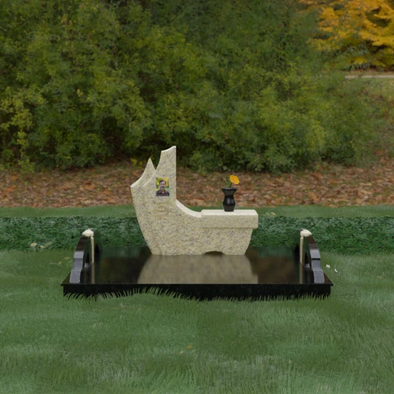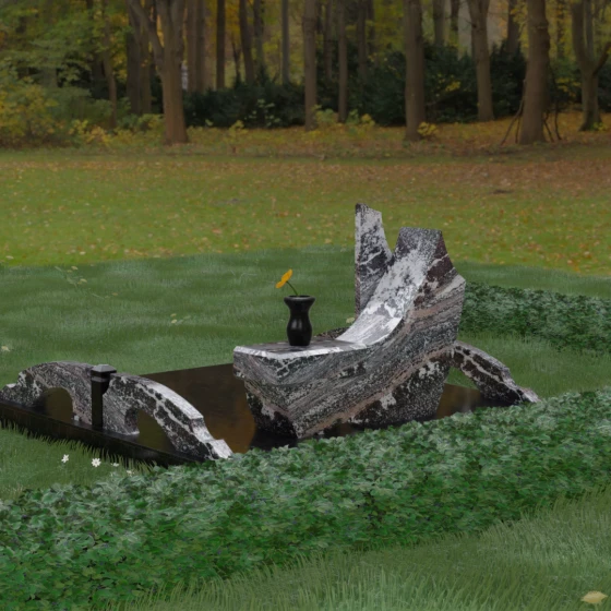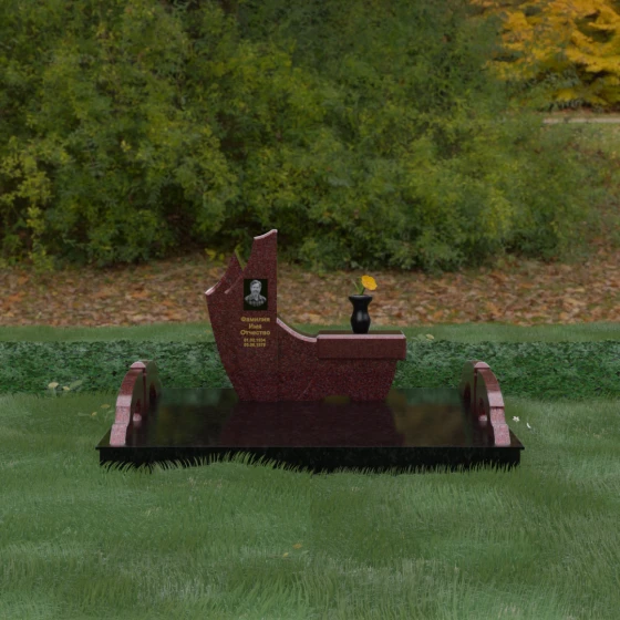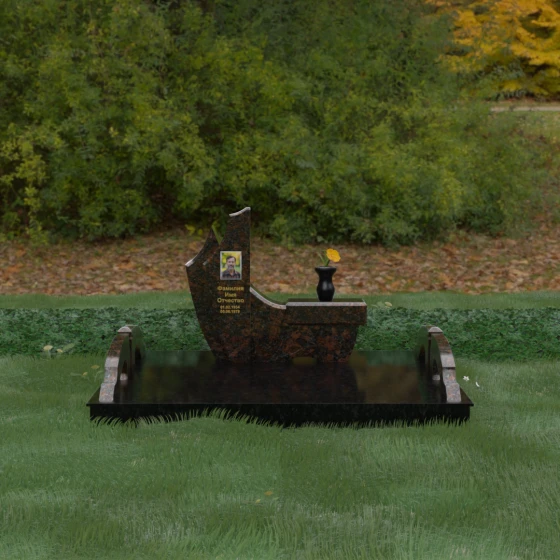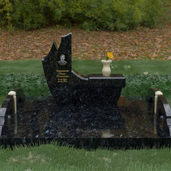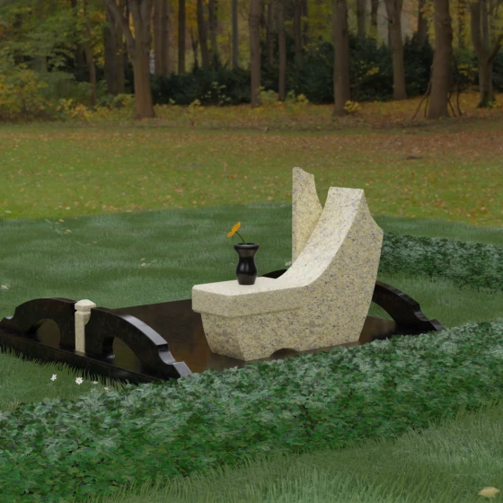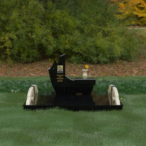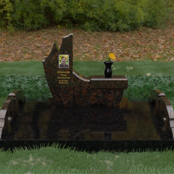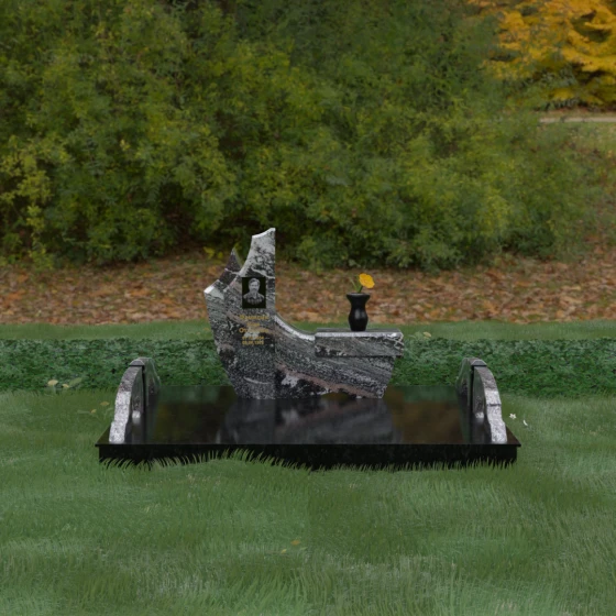 Данный гранитный монумент представляет собой эксклюзивное архитектурное решение, в котором безупречная геометрия встречается с плавностью природных линий. Дизайн центрального изваяния вдохновлен образом наполненного ветром паруса или застывшего пламени: левый край стремительно уходит вверх, образуя изящный остроконечный пик, в то время как правая сторона переходит в функциональную горизонтальную полку. Такая асимметрия позволяет создать динамичную композицию, притягивающую взгляд игрой света на зеркально отполированных поверхностях. Каждая грань здесь тщательно обработана, а фаски сняты таким образом, чтобы подчеркнуть монументальность камня и придать ему дополнительный визуальный объем.