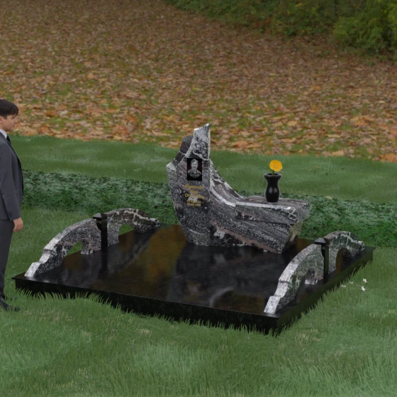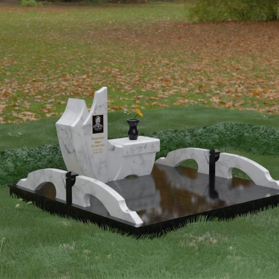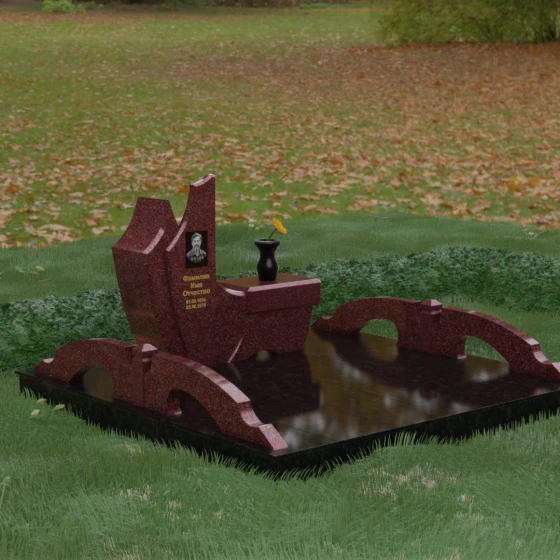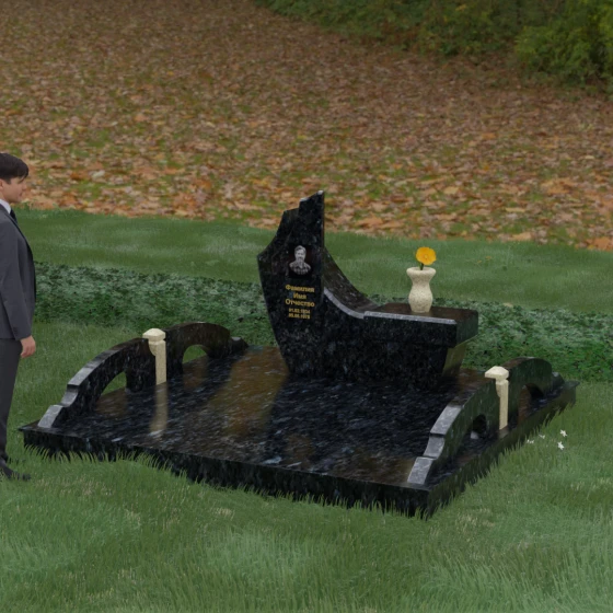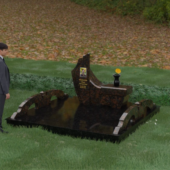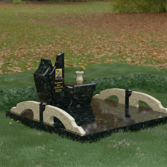 Особого внимания заслуживает комплексное благоустройство участка, входящее в концепцию данного мемориала. Вместо привычного открытого грунта здесь используется сплошное мощение массивными плитами, что обеспечивает не только величественный вид, но и исключительную чистоту: сорняки и грязь больше не будут беспокоить место памяти. По краям площадки установлены уникальные декоративные элементы — стилизованные каменные мостики или арки из светлого гранита, которые выступают в роли изящных ограничителей пространства. Завершает ансамбль точеная ваза из натурального камня, расположенная на специальном выступе основного изваяния, что создает единую, неразрывную художественную линию.