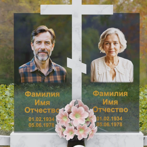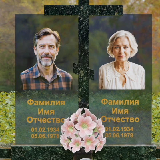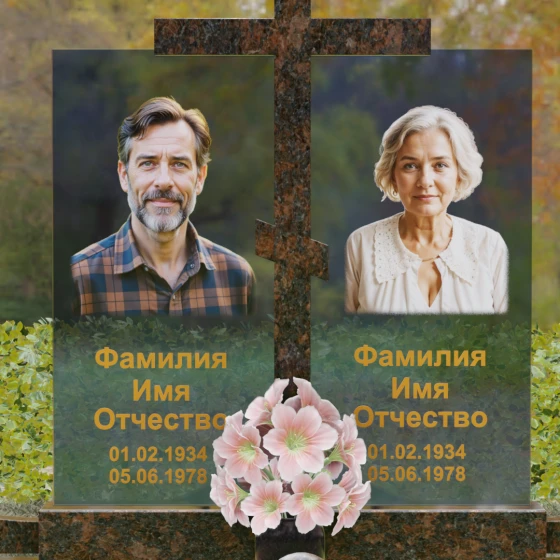 Особое внимание уделено контрасту фактур. Глубокий, насыщенный цвет основного камня противопоставлен прозрачности и легкости комбинированных вставок, на которых размещаются портреты. Грани каждой детали обработаны методом алмазного шлифования, что исключает появление микротрещин и гарантирует сохранение первозданного блеска на столетия. Нижняя часть мемориала поддерживается массивным основанием, переходящим в художественно оформленный цоколь.