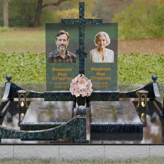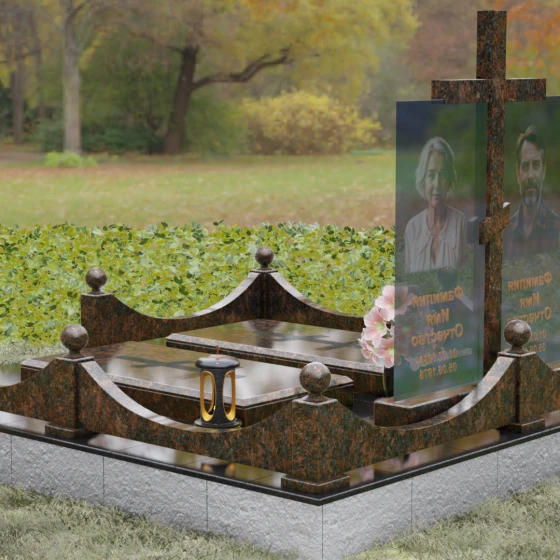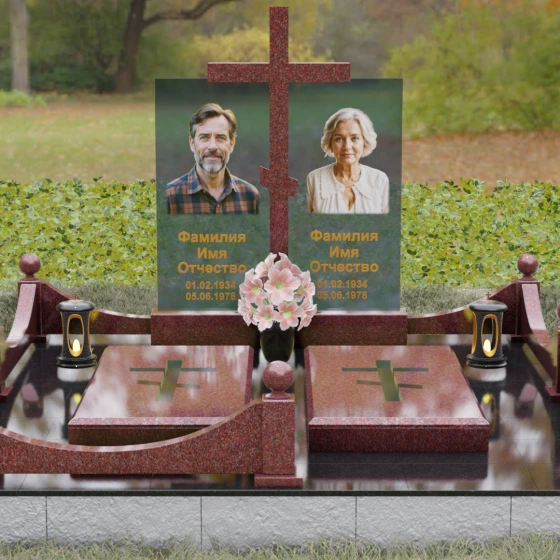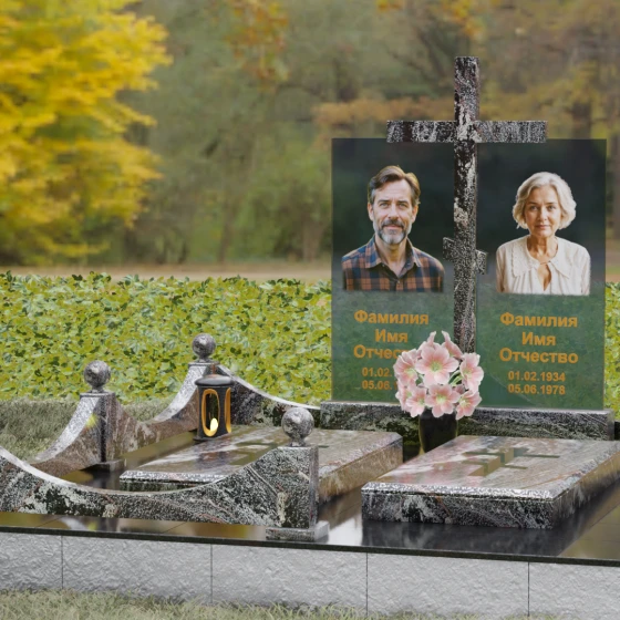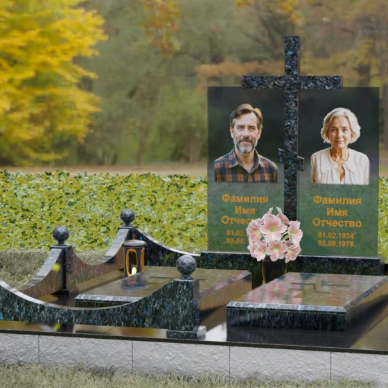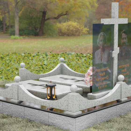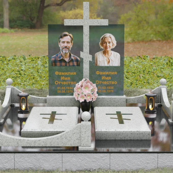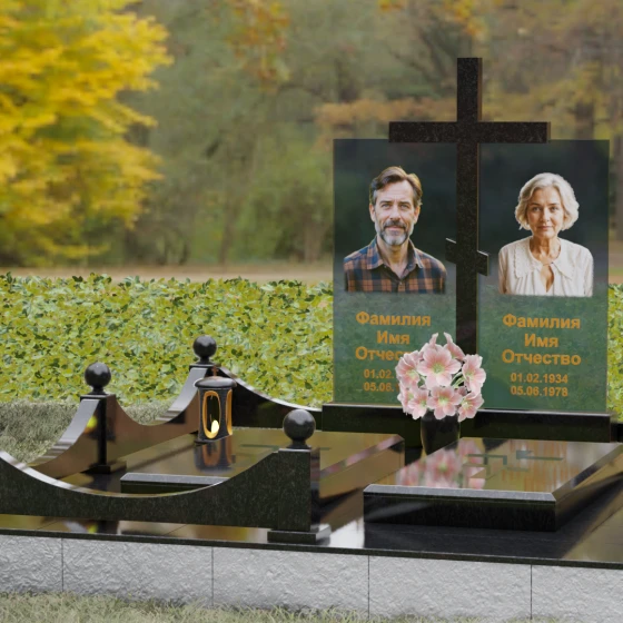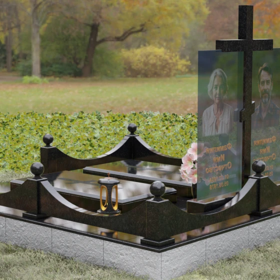 Данная модель олицетворяет собой концепцию «семейного пристанища». Горизонтальная направленность комплекса и объединение двух стел общим крестом символизируют единство душ и защиту свыше. Благоустройство участка продумано до мелочей: по периметру установлен низкий гранитный бордюр, угловые элементы которого украшены декоративными полированными шарами — символами завершенности и бесконечности бытия. В передней части установлены изящные каменные лампадки, предназначенные для ритуального огня, и массивная ваза с мягкими, округлыми формами, которая уравновешивает строгость прямых линий стелы. Полное отсутствие открытого грунта благодаря мощению плитами обеспечивает чистоту и минимизирует необходимость в сложном уходе, сохраняя эстетику места поклонения десятилетиями.