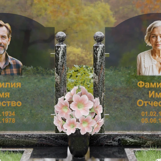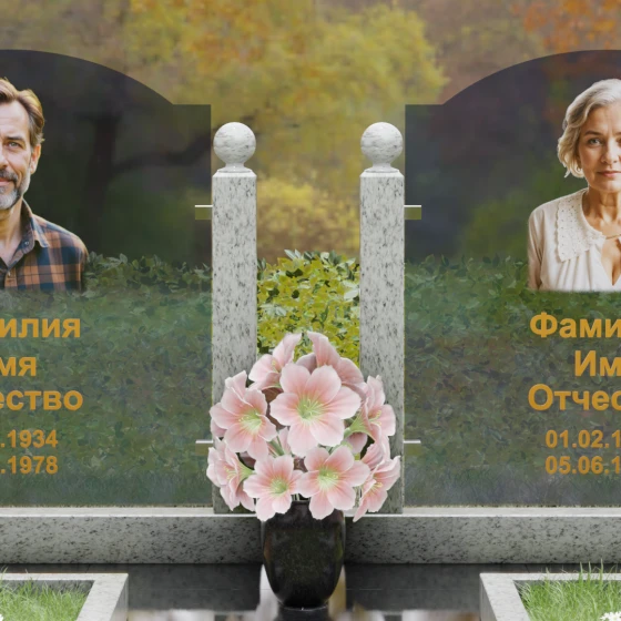Центральным элементом композиции являются две величественные стелы, выполненные в форме изящных арок. Геометрия модели сочетает в себе строгую вертикаль массивных гранитных столбов и плавную, почти невесомую линию верхнего свода. Особое внимание привлекает инновационное сочетание материалов: основная часть стелы представляет собой прозрачное или тонированное полотно, на которое нанесены высокореалистичные портреты и золоченая гравировка. Такая конструкция создает удивительный эффект легкости — свет, проходя сквозь портреты, оживляет их, создавая глубокую художественную перспективу.