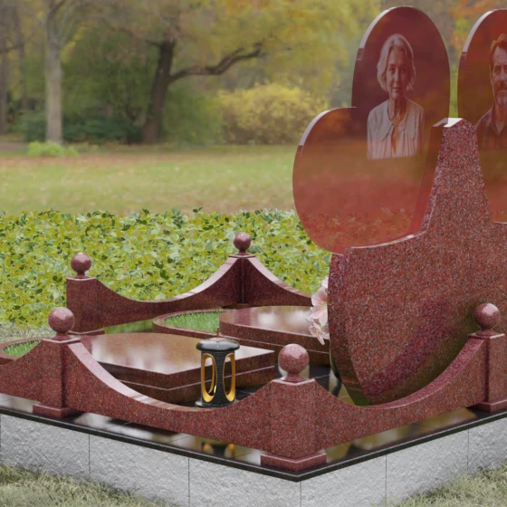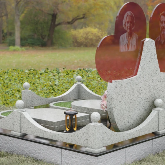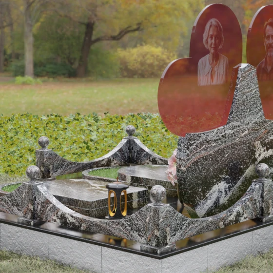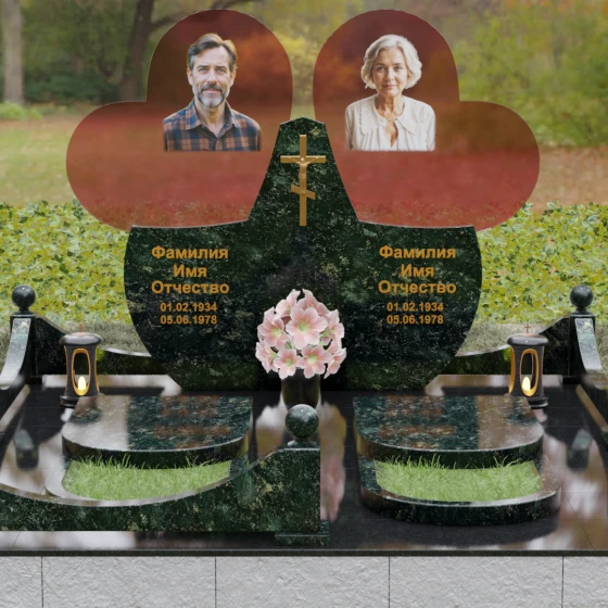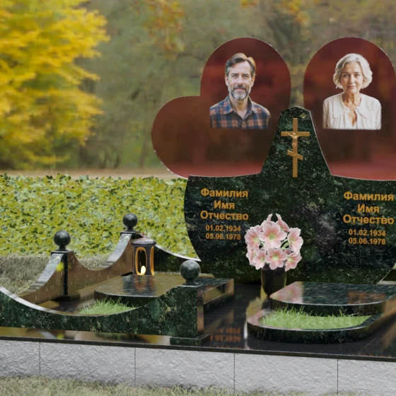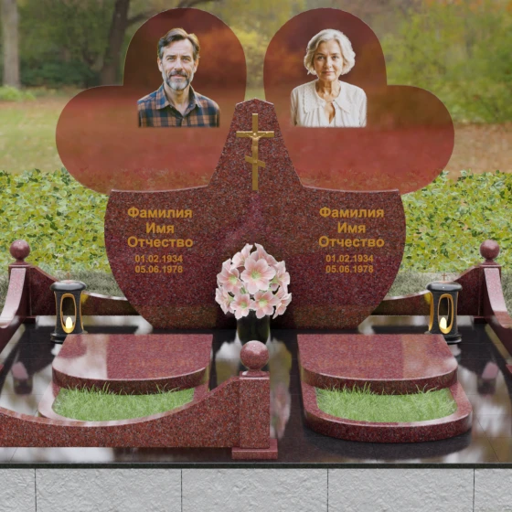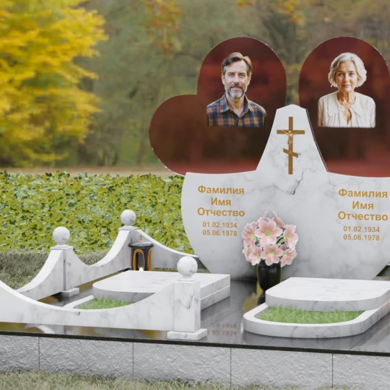 Форма двойного сердца выбрана не случайно — она символизирует неразрывную связь двух людей, чей жизненный путь был общим. Плавные волны верхней кромки изваяния вызывают чувство умиротворения и покоя, а мощное основание говорит о надежности и незыблемости памяти. Мемориал установлен на массивный гранитный цоколь, обеспечивающий безупречную устойчивость всей конструкции на десятилетия.