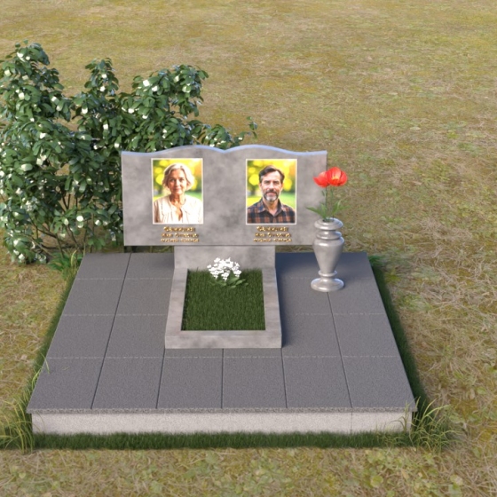 Этот гранитный монумент представляет собой вертикальную композицию, где основной акцент сделан на верхней части. Верхний край памятника имеет сложную, волнообразную форму, напоминающую плавные изгибы морской волны или нежные лепестки цветка. Этот элемент придает монументу легкость и изящество, смягчая строгость камня. Боковые грани монумента обработаны таким образом, чтобы подчеркнуть его вертикальность и стройность. Фаски по краям смягчают переход от лицевой поверхности к боковым, создавая ощущение завершенности и гармонии. Лицевая сторона монумента отполирована до зеркального блеска, отражая небо и окружающий мир, словно запечатлевая в себе вечность. На полированной поверхности выгравированы портреты усопших, выполненные с высокой степенью детализации. Под портретами расположены надписи с именами и датами жизни, выполненные строгим, элегантным шрифтом.