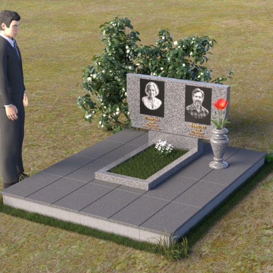 Это ритуальное изделие представляет собой гармоничное сочетание прямых линий и мягких, едва уловимых изгибов, создающих ощущение покоя и умиротворения. Стела имеет прямоугольную форму, но ее верхняя грань слегка скошена, что придает ей визуальную легкость и динамику. Обратите внимание на зеркальную полировку лицевой стороны – она отражает небо и окружающий мир, словно заключая в себе вечность. На полированной поверхности выгравированы портреты усопших и памятные надписи, выполненные с высокой точностью и детализацией. Слева от стелы, на основании, располагается небольшая горизонтальная плита с аналогичной полировкой, создающая дополнительное пространство для цветов или памятных предметов. Основание памятника выполнено из серого камня с матовой фактурой, что создает контраст с блестящей стелой и придает композиции устойчивость и завершенность. Рядом с плитой установлена ваза, выполненная из того же черного полированного гранита, что и стела, что обеспечивает единство стиля и служит достойным обрамлением для живых цветов, символизирующих вечную память.