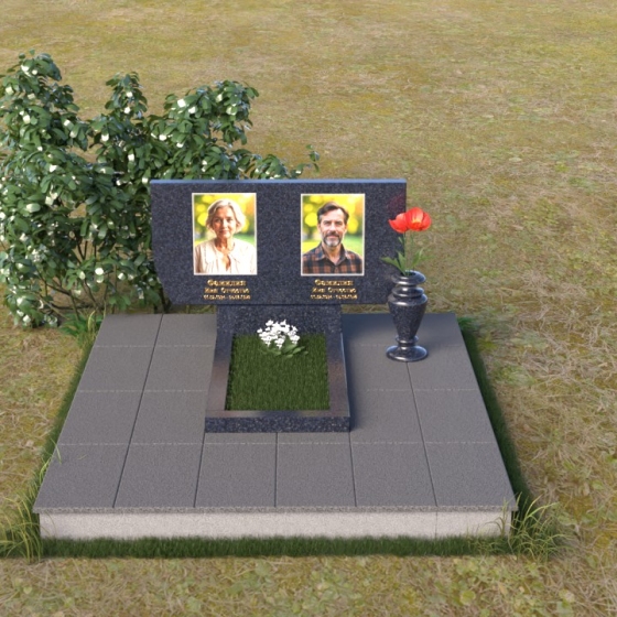 Памятник ПГ015 представляет собой композицию, состоящую из массивной стелы, горизонтальной плиты и тумбы. Стела, выполненная в форме прямоугольника со слегка скошенными верхними углами, создает ощущение надежности и основательности. Зеркальная полировка камня придает ей благородный блеск, отражая свет и создавая игру теней, подчеркивающую глубину и объем. На стеле располагаются два портрета, выполненные с высокой точностью, а также памятные надписи, выполненные золотым шрифтом. Справа от портретов, словно символ вечной памяти, размещена небольшая ваза, в которой можно разместить живые или искусственные цветы.