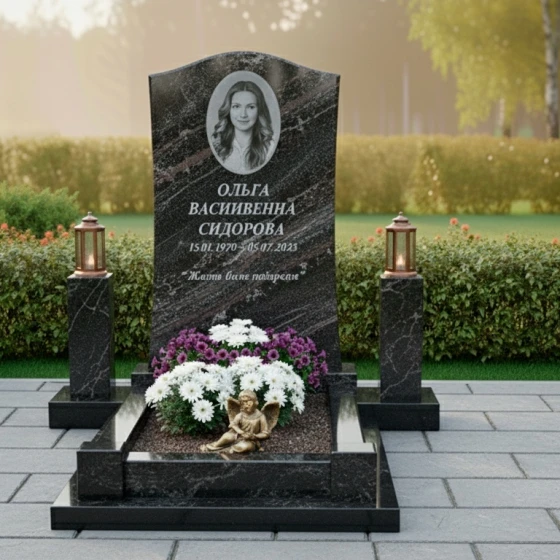 Особое внимание уделено благоустройству участка. Монумент установлен на прочный, низкий гранитный цоколь, который четко очерчивает границы мемориала, придавая ему завершенный и монументальный вид. Надгробная плита, выполненная из того же глубокого черного гранита, что и стела, создает единое, безупречное покрытие, которое не только эстетично, но и значительно упрощает уход за местом упокоения. По углам комплекса расположены два массивных каменных столбика из светлого гранита с выразительной фактурой, на которых установлены изящные бронзовые лампады. Эти лампады с их теплыми оттенками металла и стекла добавляют комплексу элементы торжественности и вечного света. В центре надгробной плиты находится небольшая, аккуратно оформленная клумба, где пышные белые и фиолетовые цветы создают живой акцент, символизирующий продолжение жизни и красоту. Рядом с цветами расположена небольшая фигурка спящего ангела, выполненная из бронзы, что добавляет композиции трогательности и символизма, напоминая о чистоте и невинности души.