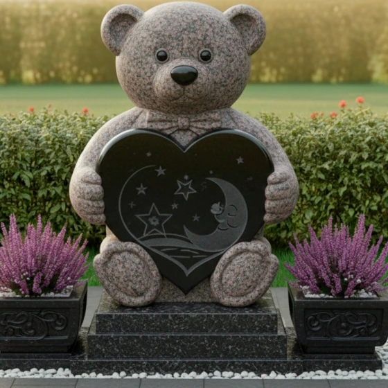 Геометрия модели сверху донизу продумана до мелочей. Основная стела, выполненная в виде медвежонка, имеет плавные, округлые линии, что создаёт ощущение мягкости и уюта. Фигура установлена на ступенчатом основании, которое придаёт всей конструкции дополнительную устойчивость и монументальность. Каждая ступень основания, как и сам медвежонок, имеет идеально отполированные грани, отражающие свет и создающие игру теней. Фактура камня демонстрирует великолепный контраст: зеркальная чёрная полировка основной части стелы и надгробной плиты эффектно сочетается с более матовыми, но при этом гладкими поверхностями резных элементов. Это создаёт ощущение глубины и многогранности, подчёркивая каждую деталь.