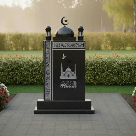 Данное изваяние представляет собой сложный архитектурный ансамбль, выполненный с ювелирной точностью. Центральная стела имеет строгую прямоугольную форму, которую венчает величественный купол, завершенный филигранно вырезанным мусульманским полумесяцем со звездой. По бокам от основного свода расположены декоративные элементы, имитирующие верхушки минаретов с имитацией ажурных решеток, что придает всей конструкции вид священного храма. Особое внимание стоит уделить обработке кромок: каждая фаска снята под идеальным углом, подчеркивая монументальность и четкость линий.