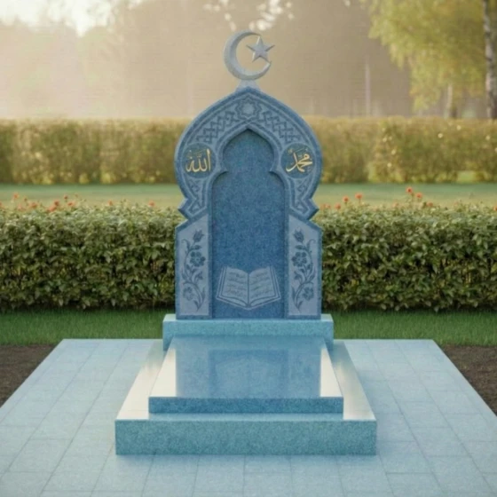 Ритуальное изделие артикула ПН 510 представляет собой глубокое художественное осмысление вечности и памяти, воплощенное в камне. Это не просто надгробие, а целая архитектурная форма, призванная стать молчаливым свидетельством уважения и любви. Центральная стела, выполненная в глубоком черном цвете, символизирует безмятежность и покой, а ее очертания напоминают величественный вход в священное пространство. Верхняя часть стелы увенчана исламским полумесяцем со звездой, выполненным из светлого камня, что создает выразительный контраст и придает композиции духовную значимость.