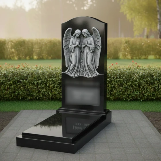 Центральным визуальным акцентом модели является глубокий барельеф, на котором запечатлены два склонившихся в молитве ангела. Мастерство резьбы проявляется в тончайшей проработке деталей: мягкие складки ниспадающих одеяний, текстурированные перья распахнутых крыльев и смиренные лики создают ощущение одухотворенности камня. Особого внимания заслуживает игра контрастов. В то время как основное полотно стелы имеет зеркальную, угольно-черную или глубокую цветную полировку, сами фигуры ангелов выполнены в технике матового среза. Это создает уникальный эффект объема — свет, попадая на полированную плоскость, отражается, в то время как рельефные элементы поглощают его, формируя глубокие тени и подчеркивая каждую линию резца.