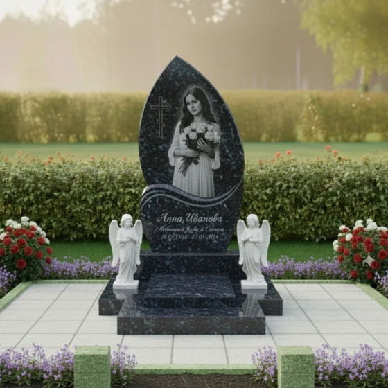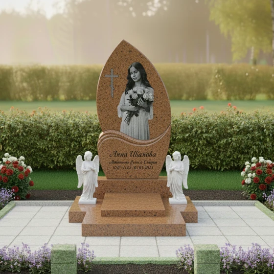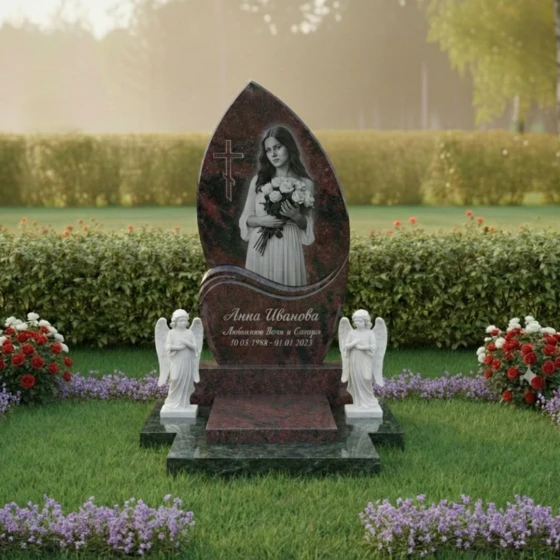 Форма стелы, стремящаяся ввысь, символизирует бессмертие души и её восхождение к свету. Асимметрия композиции подчеркивает уникальность жизненного пути, который никогда не бывает прямолинейным. Две белоснежные скульптуры ангелов, замершие в молитвенном предстоянии у подножия, выступают в роли стражей вечного сна, привнося в ансамбль ощущение небесного покровительства и утешения. Резная волна в основании воспринимается как символ быстротечного времени, которое разбивается о твердыню вечной памяти.