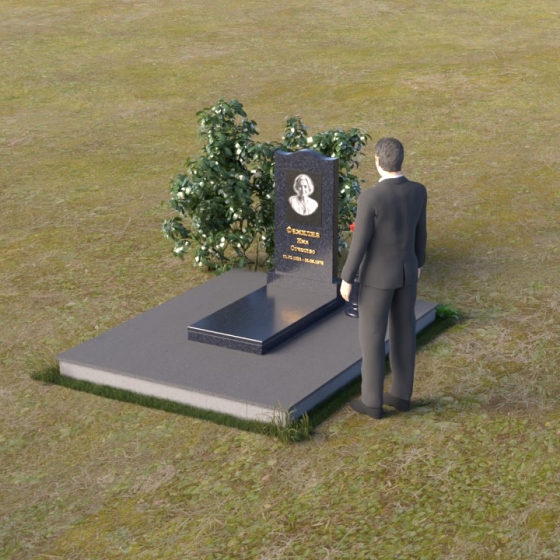 Величественная стела памятника ПВ 008 представляет собой элегантное сочетание строгих линий и плавных изгибов. Верхняя часть стелы имеет волнообразную форму, смягчающую строгость камня и придающую ей утонченность. Грани стелы тщательно отполированы до зеркального блеска, отражая свет и создавая ощущение легкости и воздушности. На лицевой стороне стелы размещен портрет усопшего, выполненный методом гравировки. Ниже располагаются надпись с именем и датами жизни. Под стелой расположена горизонтальная плита, также выполненная из полированного гранита. Ее строгие прямоугольные формы контрастируют с плавными линиями стелы, подчеркивая ее выразительность. Фаски по периметру плиты смягчают углы и придают ей завершенный вид. Рядом со стелой установлена небольшая ваза из темного гранита с изящным орнаментом, предназначенная для живых цветов.