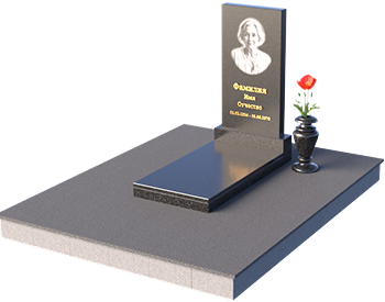 Основной акцент в этой модели сделан на контрасте фактур. Зеркальная полировка черного гранита Габбро-диабаз, из которого выполнена стела, создает эффект бесконечности, отражая небо и окружающий мир. На этом фоне особенно выразительно смотрится гравировка портрета и надписи, выполненные с ювелирной точностью. Нижняя часть стелы, переходящая в горизонтальную плиту, также выполнена из черного гранита, но уже с матовой обработкой, что придает композиции дополнительную глубину и текстуру. Рядом располагается ваза из того же гранита, выполненная в классическом стиле, предназначенная для живых цветов, которые станут символом памяти и любви.